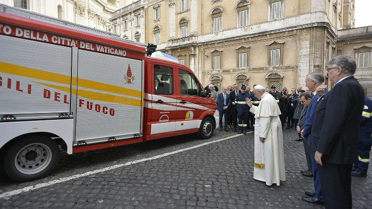 Megáldotta a vatikáni tűzoltóság új kocsiját Ferenc pápa a november 6-i általános kihallgatás előtt a Szent Márta-házzal szemközti téren. Köszönetet mondott a tűzoltók hősies munkájáért, akik olykor saját életüket teszik kockára. A szentatya imáiról biztosította a szervezetet.