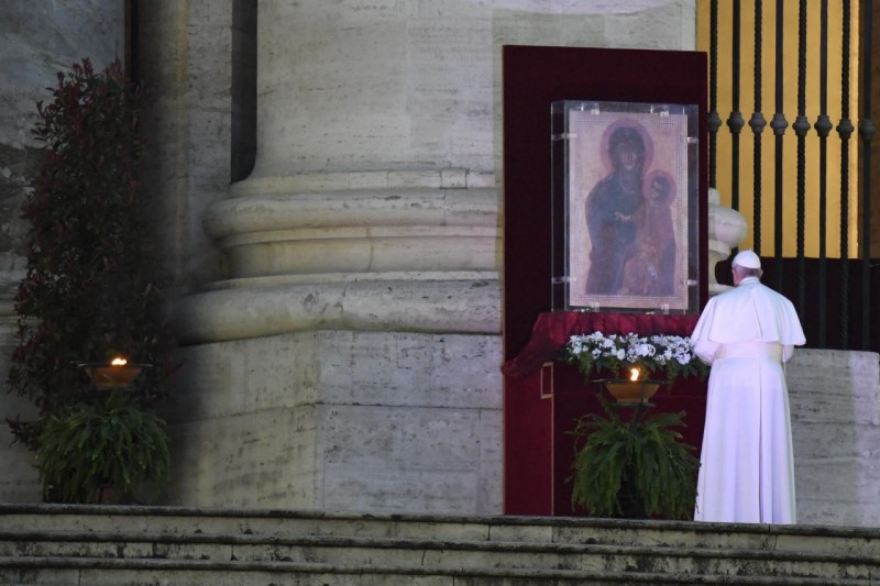 Ferenc pápa 2020. március 27-én imát vezetett, és rendkívüli, teljes búcsúval járó Urbi et Orbi áldást adott a Szent Péter-bazilika előtti üres téren, a koronavírus-világjárvány idején Isten irgalmába ajánlva Róma városát és az egész emberiséget. Beszéde után a pápa az erre a különleges alkalomra a Santa Maria Maggiore-bazilikából a Szent Péter térre érkezett Salus Populi Romani-kegykép elé járult és imádkozott.