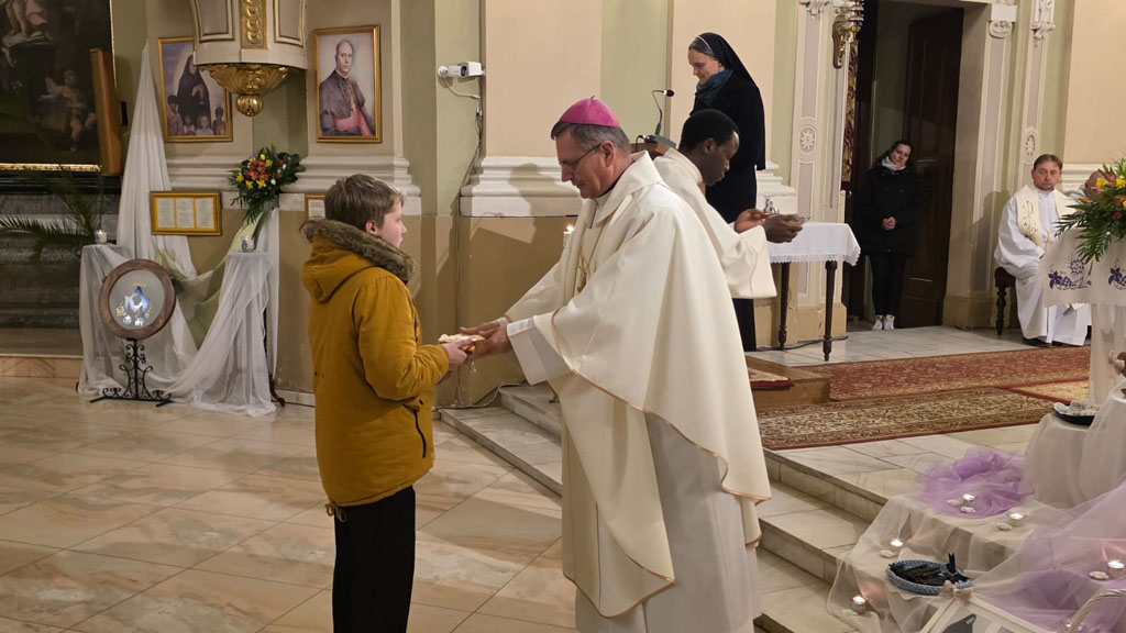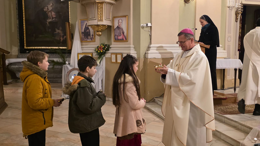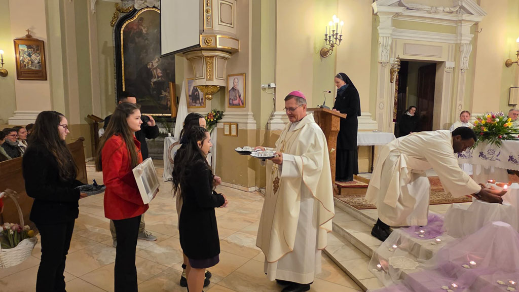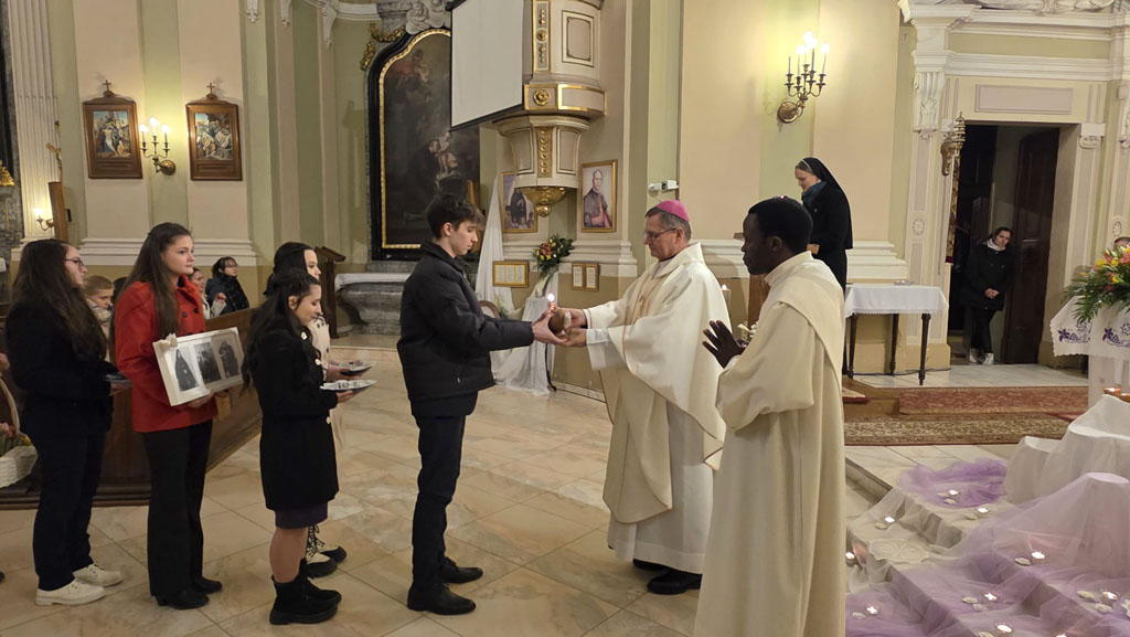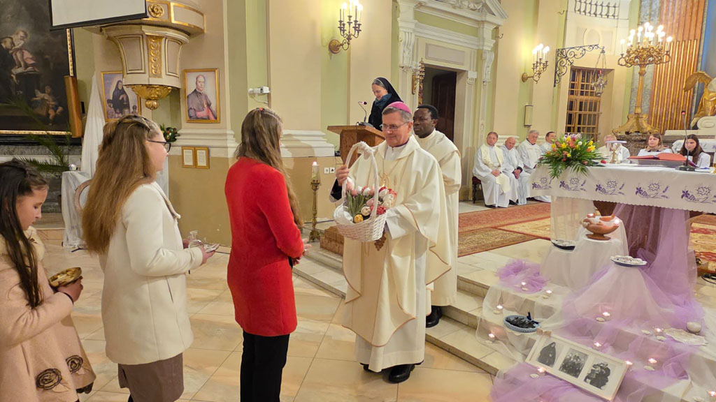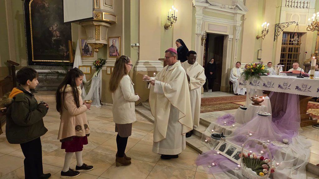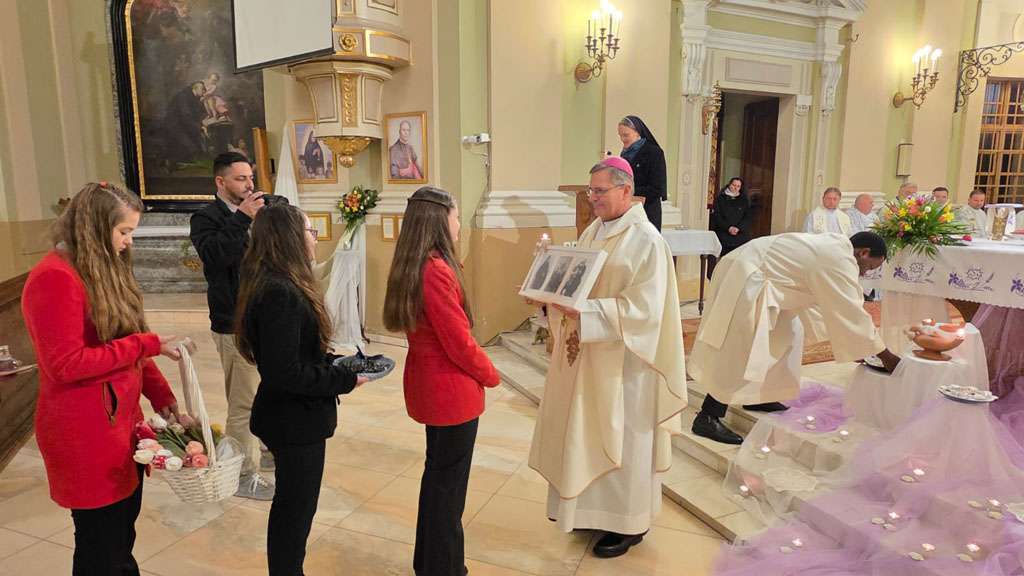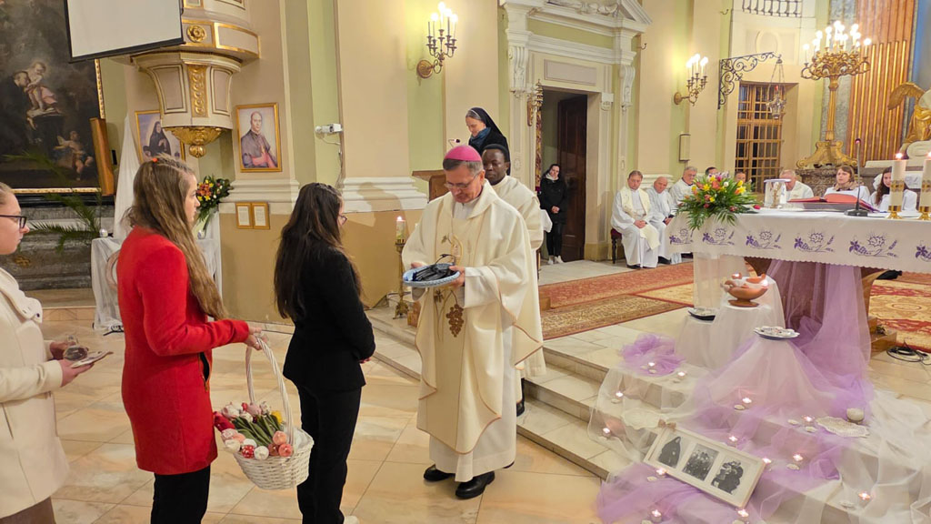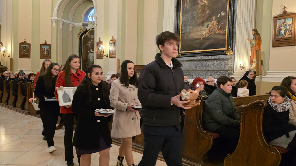 A szentbeszédet követően, a szentmise felajánlási részében a nővérek gondozásában élő gyermekek jelképes adományokat nyújtottak át a főpásztornak, amelyek mindegyike mély jelentést hordozott. Az olajmécses a Krisztus iránti szeretet tüzét jelképezi, amely erőt ad a nehézségek leküzdéséhez, míg Kalazanci Szent József és Boldog Celestina Donati ereklyéje az ő életpéldájuk követésére hív. Az alapítókat ábrázoló triptichon arra emlékeztet, hogy mindig bízzuk magunkat Isten gondviselésére, és hirdessük Jézus Krisztus szeretetét. A kulcscsomó a szív nyitottságát szimbolizálja, kifejezve a készséget, hogy Isten bármikor beléphessen életünkbe, amikor és ahogyan akarja. A gyermekek egy tulipáncsokrot is átnyújtottak, amely a jövőbe vetett reményüket és szívük tiszta szándékait fejezik ki. Az áldozati víz a szeretet utáni szomjúságot, a vágyakozást és az emberi lélek fájdalmát hordozza, míg a kenyér és a bor az Istennek szentelt szolgálat jelképeként került az oltárra, amelyek Krisztus szent testévé és vérévé válva megerősítik a belőlük táplálkozók hitét és hűségét.