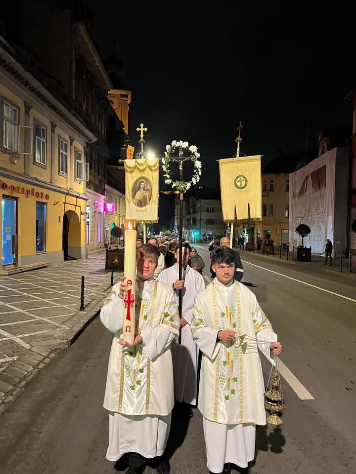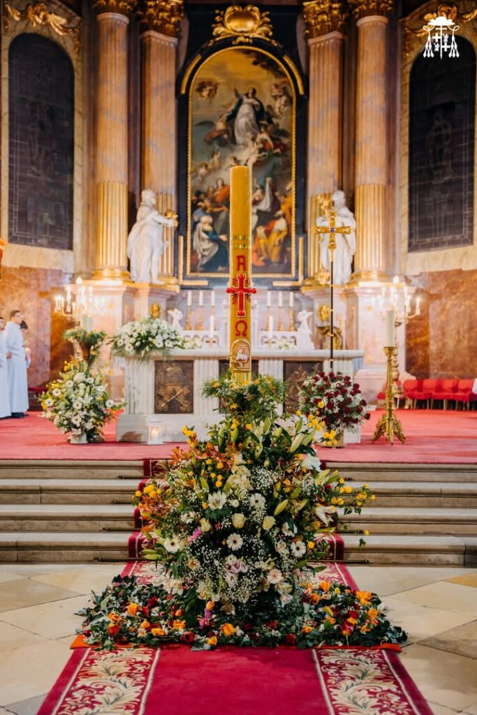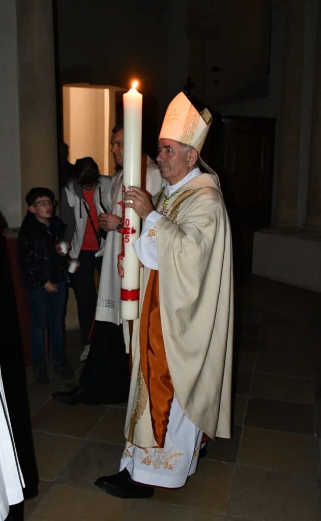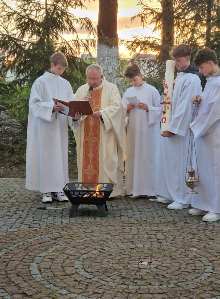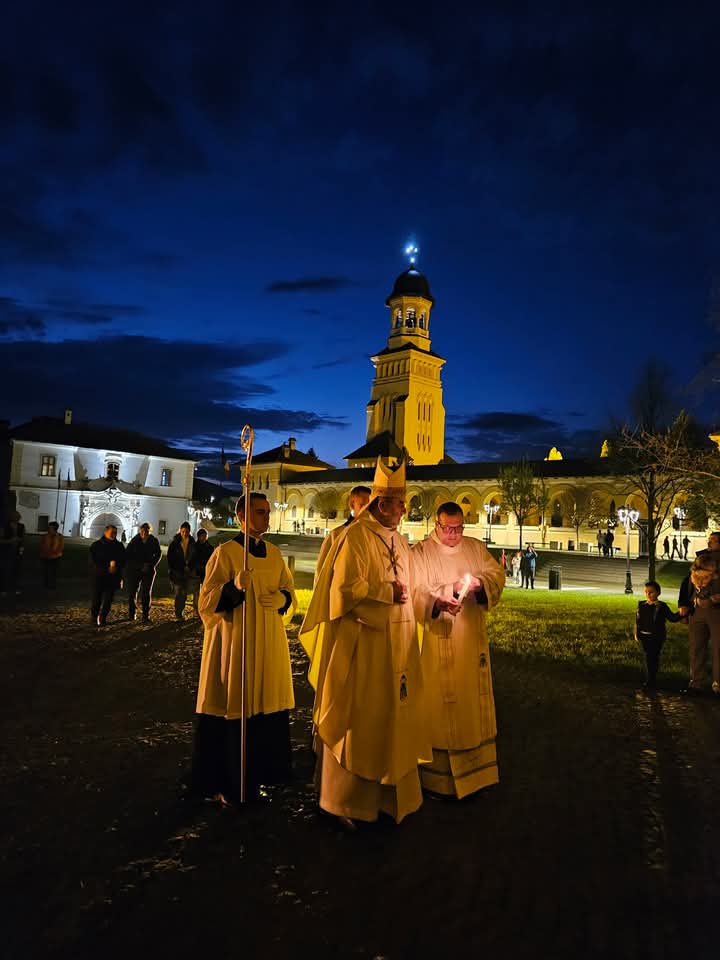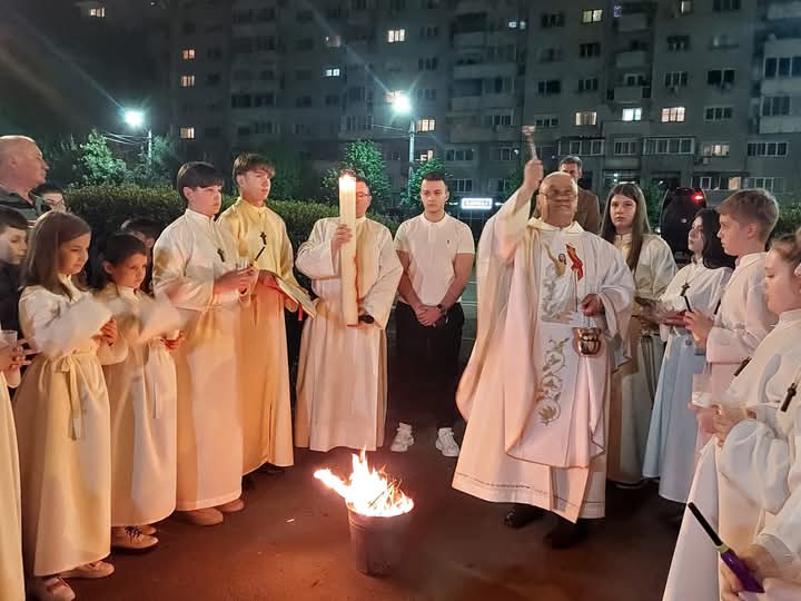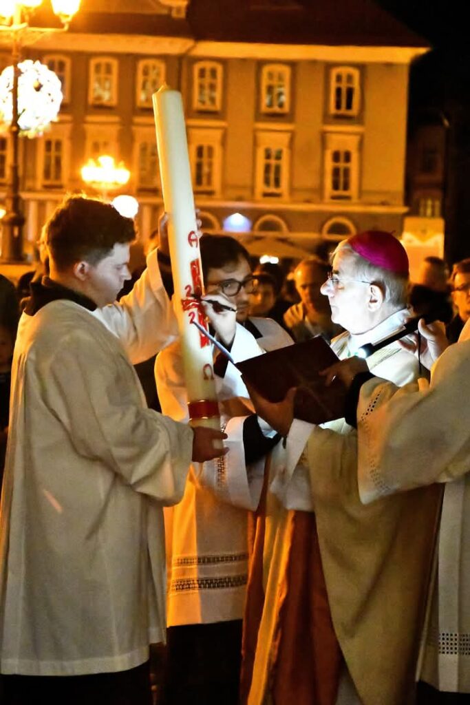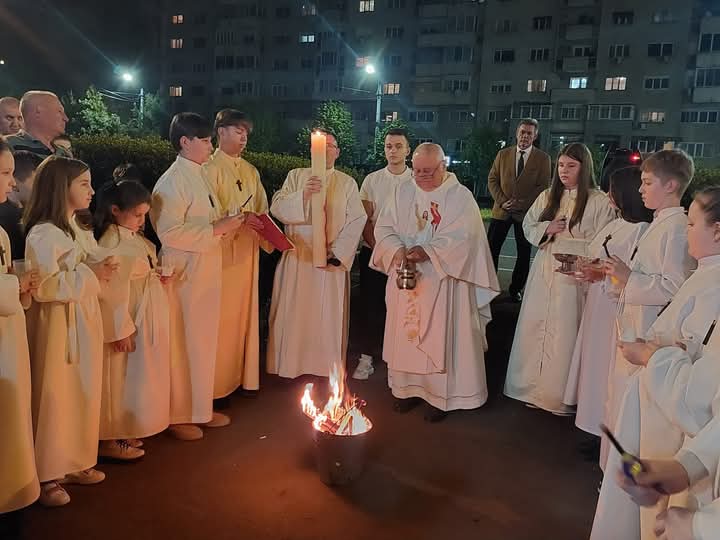 A húsvéti vigilia szertartása: 1.Tűzszentelés, majd arról a húsvéti gyertya meggyújtása. A húsvéti gyertya jelképezi a feltámadt Jézust. A templomba való bevonulás után énekli a pap a húsvéti öröméneket. 2. Igeliturgia. Az igeliturgiában kilenc olvasmány található. Hét az ószövetségből, egy szentlecke, és az evangélium, ebből legalább három ószövetségit és az evangéliumot fel kell olvasni. A szentlecke előtt megszólal az orgona, harangok és a csengők is, amelyek nagycsütörtök óta hallgatnak. A szentlecke után felhangzik az alleluja (az örvendezés éneke), ami egész nagyböjtben nem szerepelt a liturgiában. 3. A keresztség liturgiája. Vízszentelés, a keresztségi fogadalom megújítása. 4. Szentmise (Eukarisztia liturgiája) 5. Feltámadási szertartás és körmenet. 6. Te Deum. 7. Szentségi áldás.