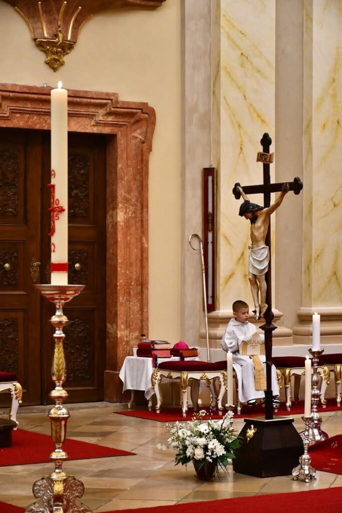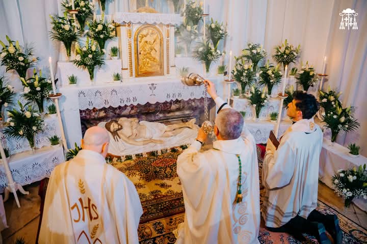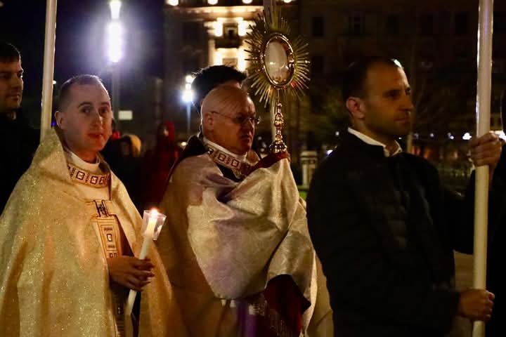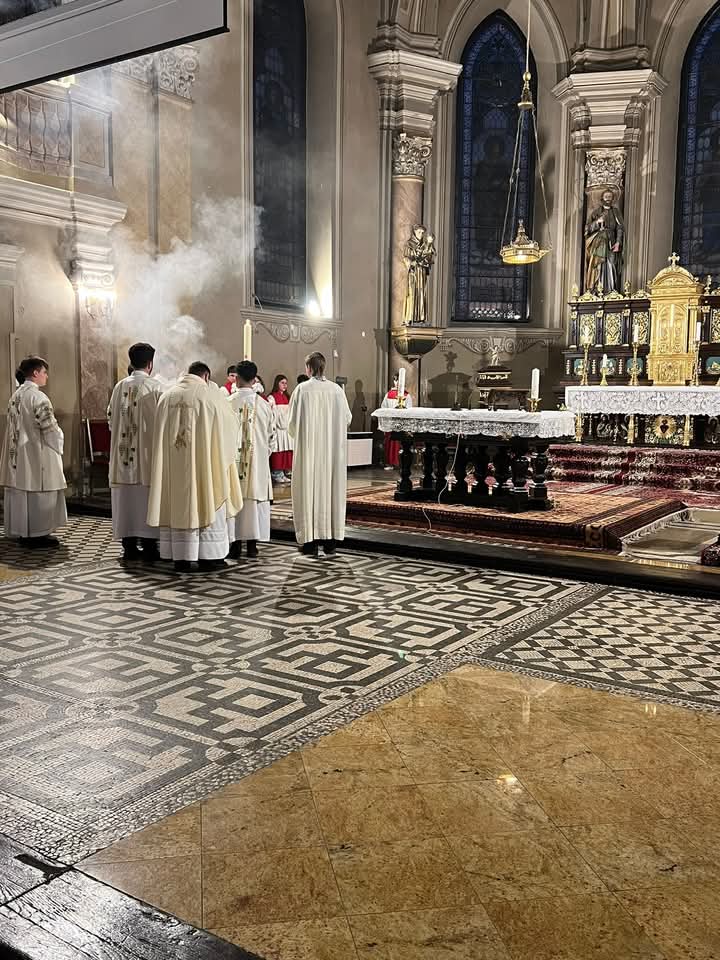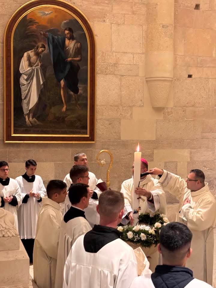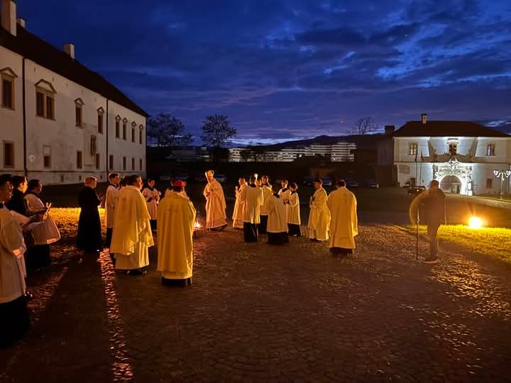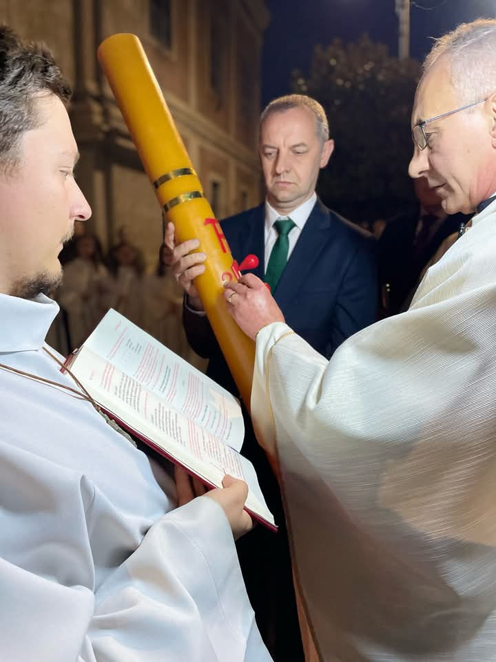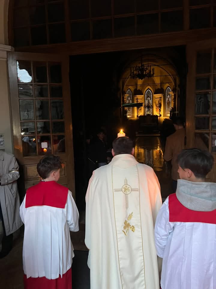A húsvéti vigilia szertartása: 1.Tűzszentelés, majd arról a húsvéti gyertya meggyújtása. A húsvéti gyertya jelképezi a feltámadt Jézust. A templomba való bevonulás után énekli a pap a húsvéti öröméneket. 2. Igeliturgia. Az igeliturgiában kilenc olvasmány található. Hét az ószövetségből, egy szentlecke, és az evangélium, ebből legalább három ószövetségit és az evangéliumot fel kell olvasni. A szentlecke előtt megszólal az orgona, harangok és a csengők is, amelyek nagycsütörtök óta hallgatnak. A szentlecke után felhangzik az alleluja (az örvendezés éneke), ami egész nagyböjtben nem szerepelt a liturgiában. 3. A keresztség liturgiája. Vízszentelés, a keresztségi fogadalom megújítása. 4. Szentmise (Eukarisztia liturgiája) 5. Feltámadási szertartás és körmenet. 6. Te Deum. 7. Szentségi áldás.
