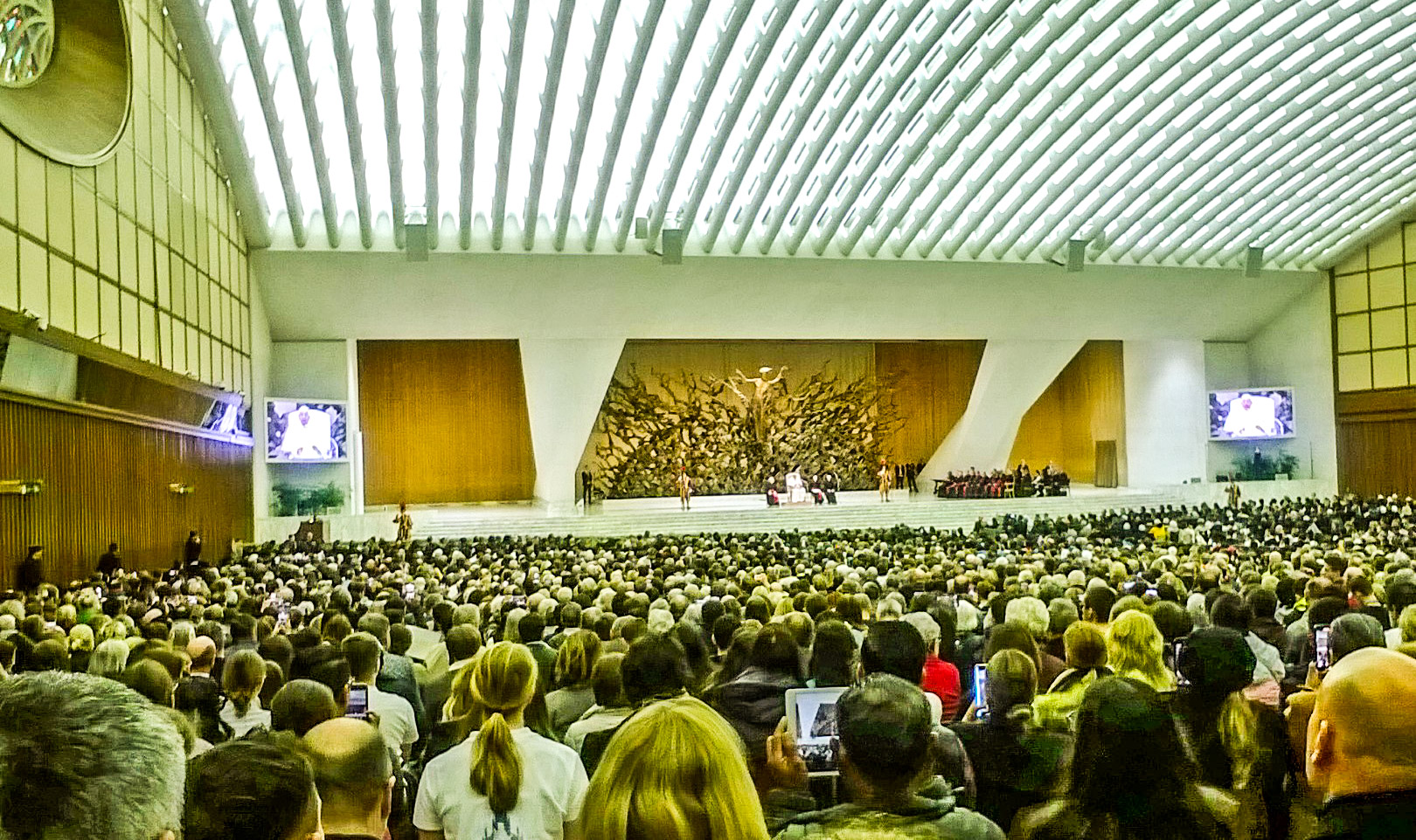 Zarándoklatunk egyszerre legrosszabb és legjobb momentuma volt ez akkor számomra. Nyomasztó és fullasztó volt (a szó szoros, fizikai értelmében is) hosszú ideig egy hatalmas, sűrű tömegben apró lépésenként araszolni előre, azzal a tudattal, hogy bizonyára esélytelen lesz (időre) bejutni az audienciára. Ugyanakkor felemelő volt megtapasztalni az összetartozást – és ezt megint szó szerint is értendő: hogy ne sodródjunk el, egymásba kapaszkodtunk, mindegyikünk fogta valamelyikünk kezét, karját, pillanatra sem engedhettük el egymást, hogy együtt tudjunk maradni.