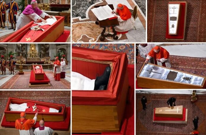 Amint korábban bejelentették, a római pápa koporsójának lezárási szertartására pénteken este 8 órakor került sor a Szent Péter-bazilika Confessio-oltáránál. A szertartás során, amelyet Kevin Joseph Farrell camerlengo bíboros vezetett, Diego Ravelli érsek, a liturgikus szertartások mestere felolvasta az okiratot (rogito), amelyet az szertartás végén a koporsóba helyeztek.