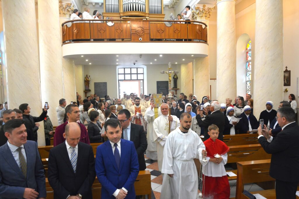 A kórus ünnepélyes éneke és a hívek öröme kíséretében vonult be az Isteni Gondviselés székesegyházba a kisinyovi püspök, Anton Coșa az egyházmegyétől ajándékként kapott miseruhában és mitrában.