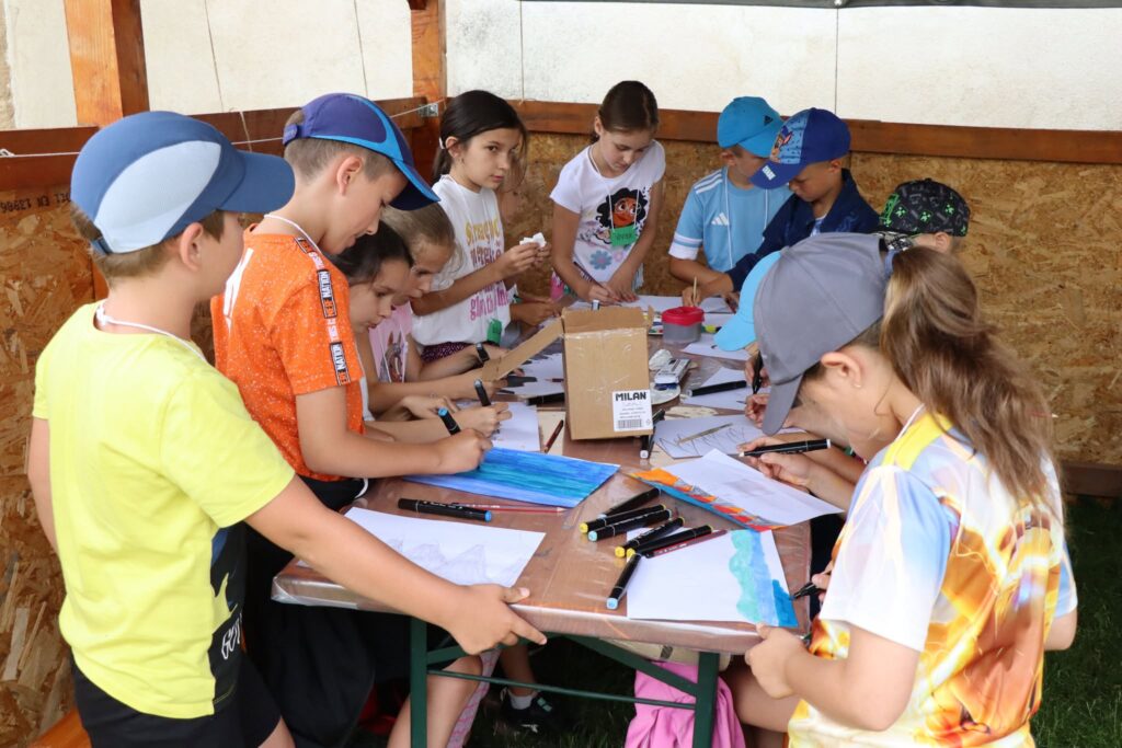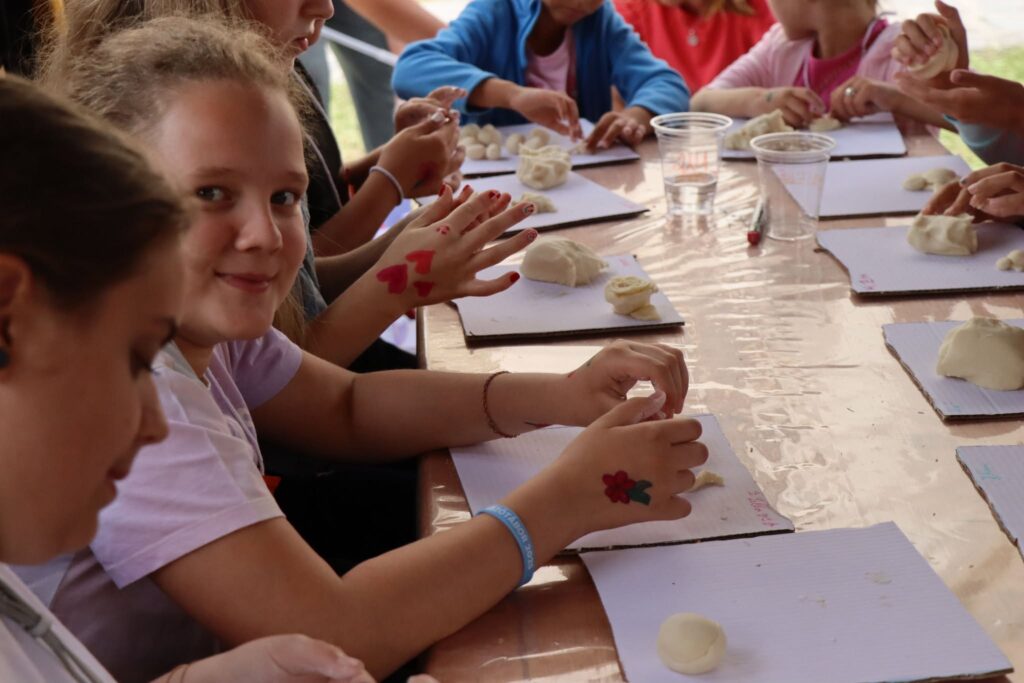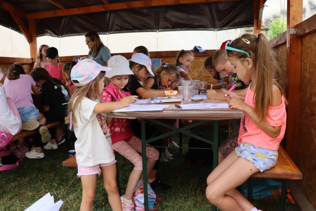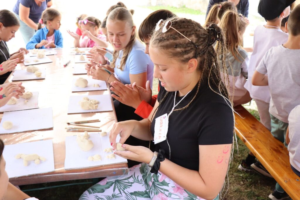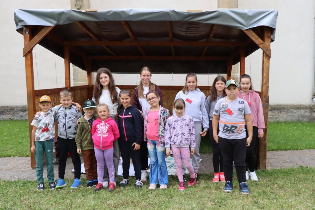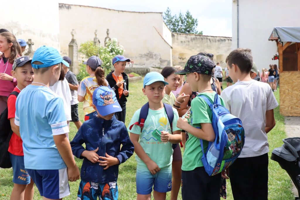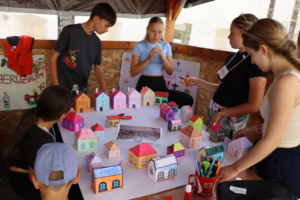 Ezt követően a gyerekek a csoportvezetőket követve elfoglalták „városaikat”, melyek a templomkertben voltak kijelölve. A már megszokott módon zászlót készítettek, felépítették a várost, megírták annak tízparancsolatát, valamint városnévsort is készítettek napi teendőkkel. Ez a sok munka ki is töltötte az első napot. A többi napokat is szentmisével indítottuk, melyet Pál Ferenc helyi plébános celebrált, majd ebédig kiscsoportos tevékenységek voltak, ahol behatóbban is megismerhették saját zarándokhelyüket a táborozók. Ebéd előtt a már megszokott szappanos játék örvendeztette a gyerekeket. Ők is tudták, hogy ez összekapcsolt kellemes-hasznos dolog, ahol lehetett kicsit pancsolni is a vizet, és a végén mégiscsak tiszta kézzel ültek asztalhoz.