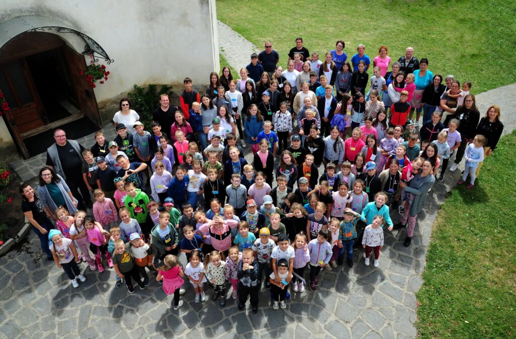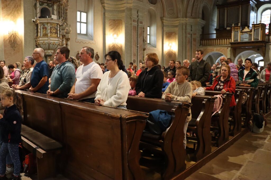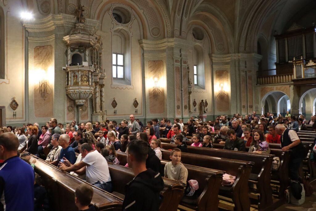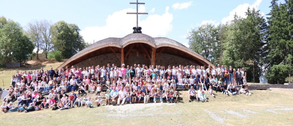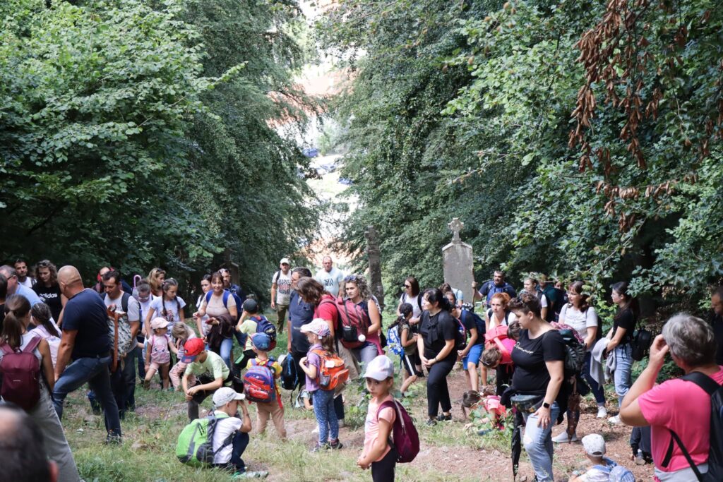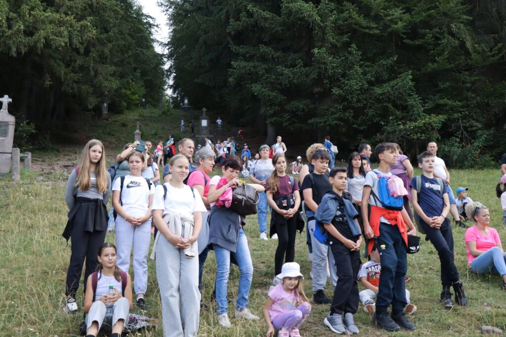 De nem merült ki ennyiben a zarándoklatunk. Elindult a több mint kétszázötven fős csapat a nyeregbe a kálvária útján, ahol keresztutat is végeztünk plébánosunk vezetésével. Isten kegyelméből jó időnk volt, így volt lehetőség a játékra is és a szülők, családok közti kapcsolatok építésére, mélyítésére. Nem maradhatott el a gyerekekkel a csoportkép a MISERICORDIA feliratnál, ahol mindenki kereste, hogy melyik betű a szimpatikusabb és természetesen gyakran feltevődött a nagy kérdés, hogy: -De ez mit jelent? Nyilván nem hagytunk válasz nélkül senkit.