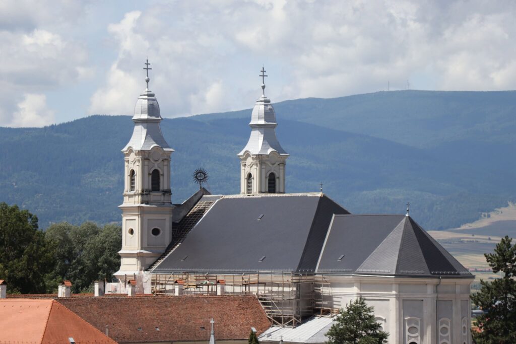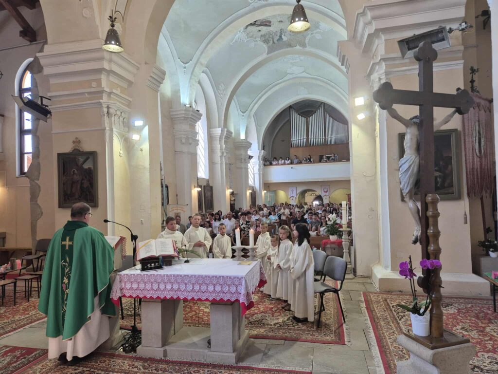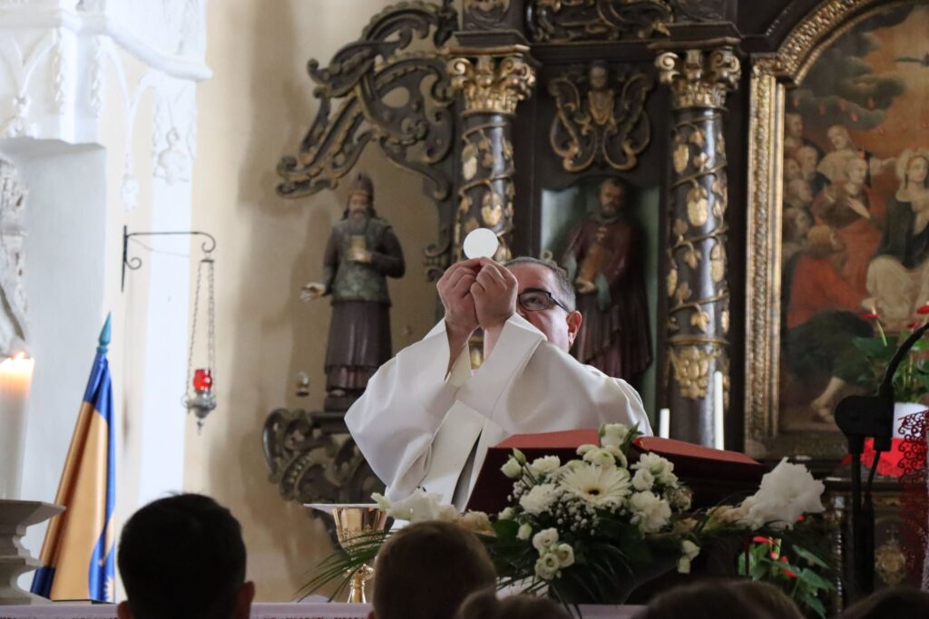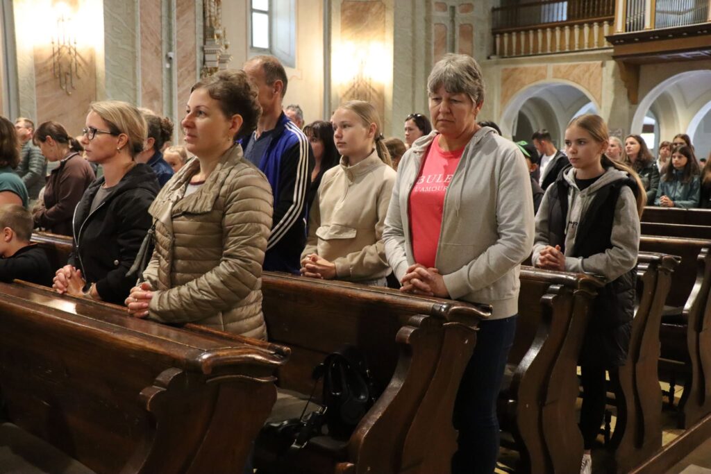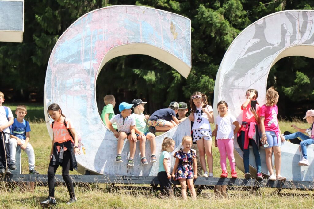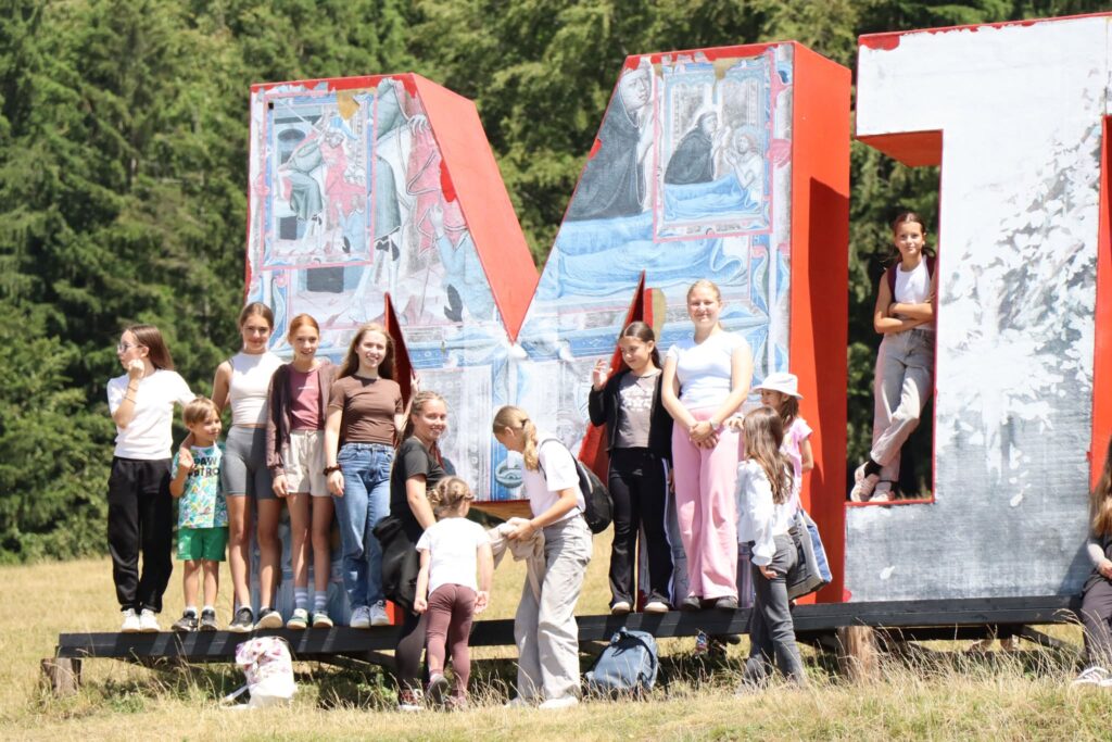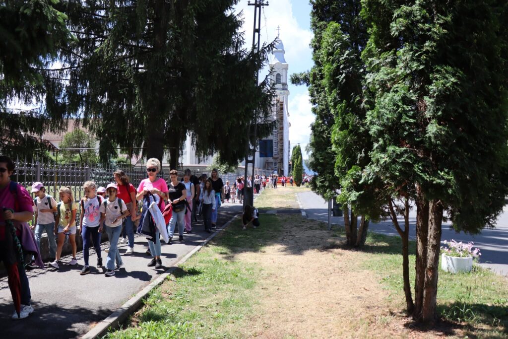 Lévén, hogy a remény zarándokai vagyunk, Csíksomlyóra látogattunk el autóbuszokkal. Ide már velünk zarándokoltak a szülők és sok esetben a nagyszülők is. Az érkezést követően szentmisén vettünk részt, melyet plébánosunk celebrált. A szentmisét követően együtt énekeltük az idei és az elmúlt évek táboros himnuszait a Szűzanya lábánál, majd egy csoportkép után pihentünk és ebédeltünk a kegytemplom előtti téren.