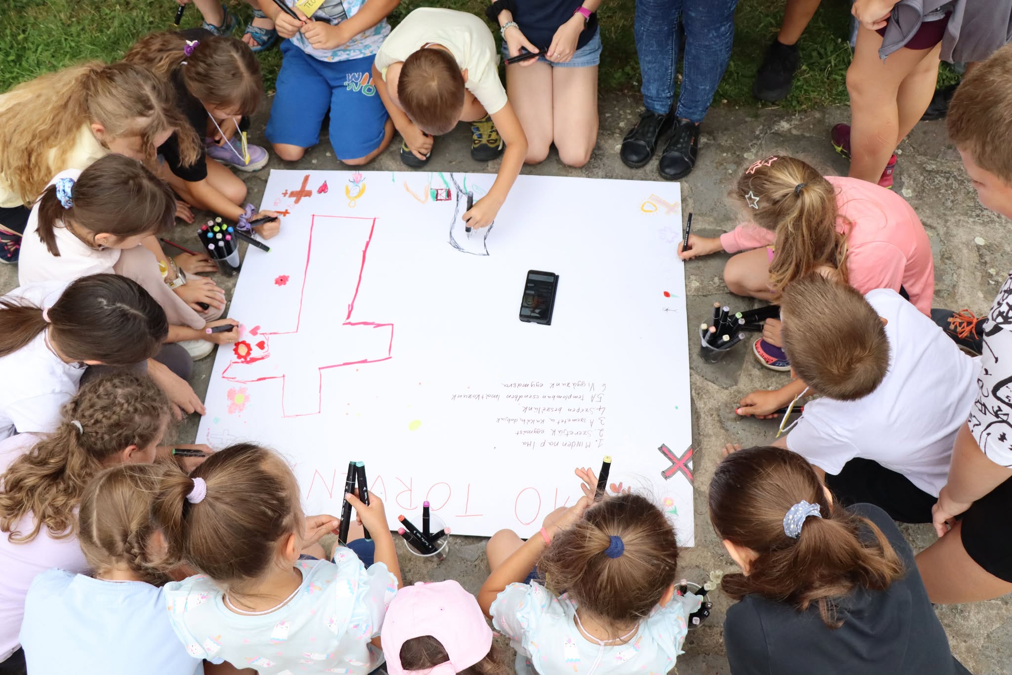 Ezt követően a gyerekek a csoportvezetőket követve elfoglalták „városaikat”, melyek a templomkertben voltak kijelölve. A már megszokott módon zászlót készítettek, felépítették a várost, megírták annak tízparancsolatát, valamint városnévsort is készítettek napi teendőkkel. Ez a sok munka ki is töltötte az első napot. A többi napokat is szentmisével indítottuk, melyet Pál Ferenc helyi plébános celebrált, majd ebédig kiscsoportos tevékenységek voltak, ahol behatóbban is megismerhették saját zarándokhelyüket a táborozók. Ebéd előtt a már megszokott szappanos játék örvendeztette a gyerekeket. Ők is tudták, hogy ez összekapcsolt kellemes-hasznos dolog, ahol lehetett kicsit pancsolni is a vizet, és a végén mégiscsak tiszta kézzel ültek asztalhoz.