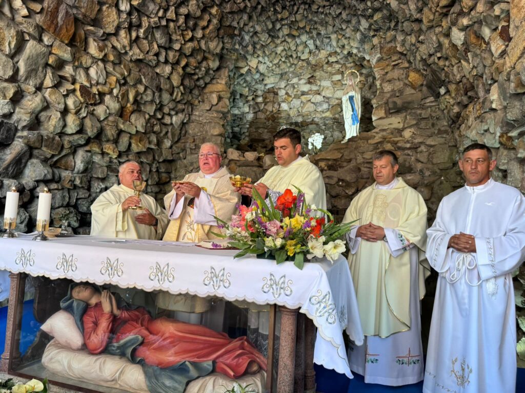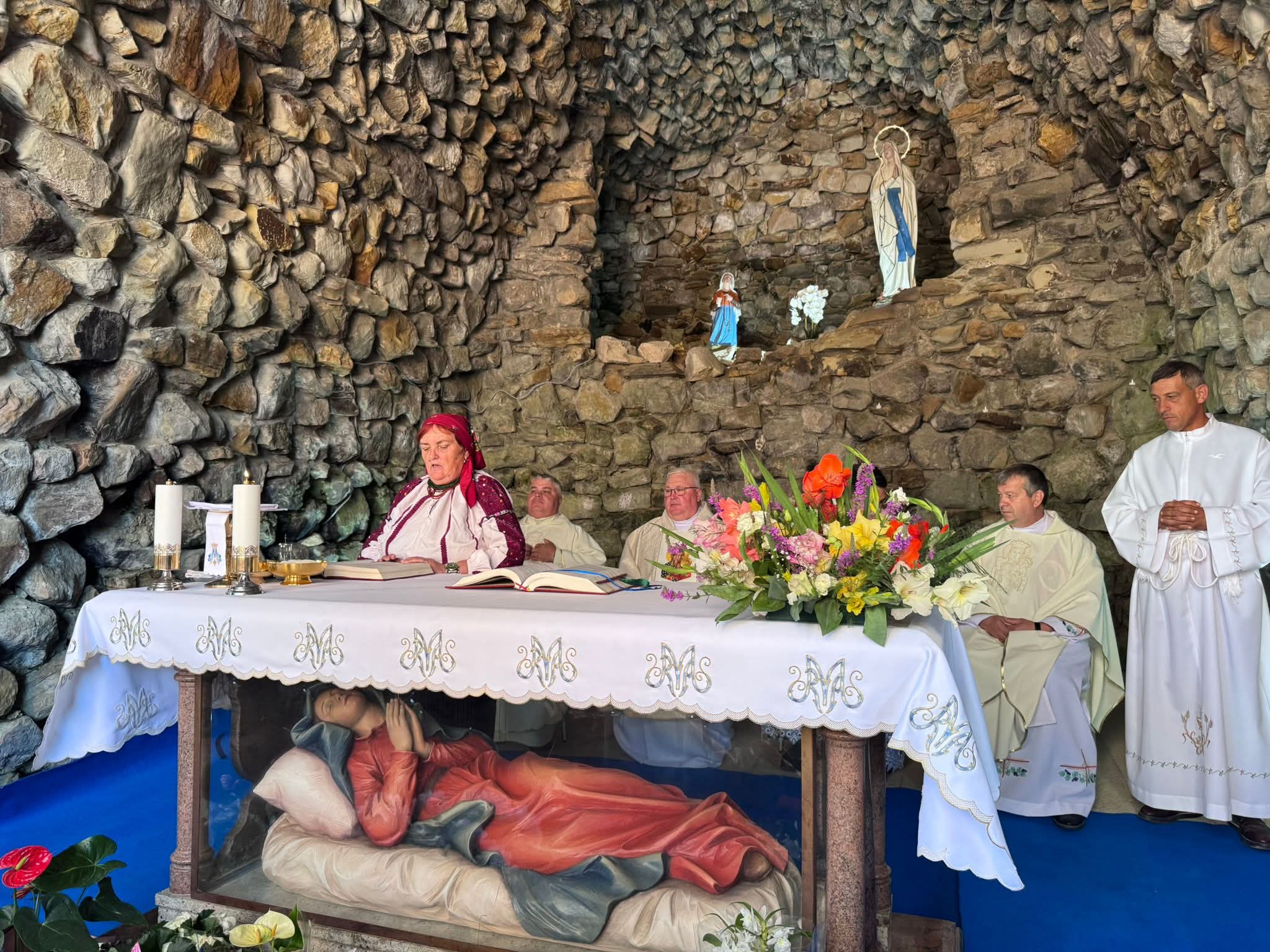 Másnap, augusztus 15-én, Nagyboldogasszony ünnepén a hívek a Grottánál gyűltek össze a 8,30-kor kezdődött magyar nyelvű szentmisére. Ezt a szentmisét a marzsinéni (Mărgineni) Varga András , a pusztinai születésű Timaru Laurențiu-Daniel, Anton Diacu pusztinai plébános és Matieș Marin celebrálták.