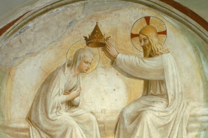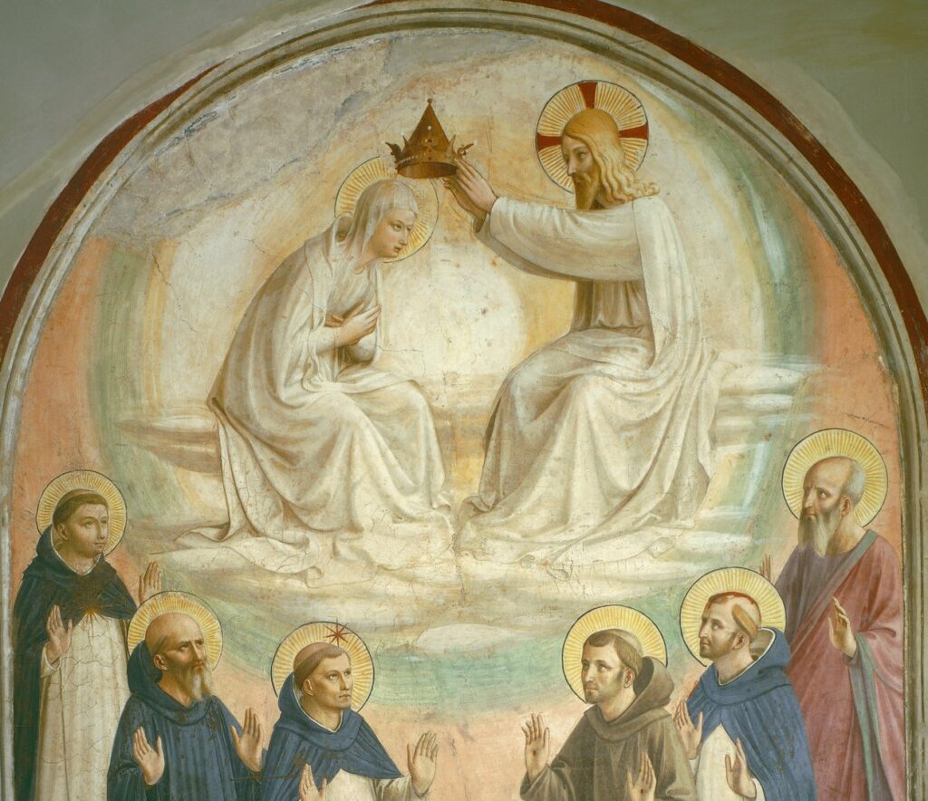 Jelen írásban egy olyan témát szeretnénk bemutatni, amely Szűz Mária megkoronázását mutatja be. A hitigazság, amelyet a kereszténység már a kezdetektől megünnepelt, végül dogma formájában is rögzült. Alapja az a hit, miszerint Szűz Mária testét nem érte romlás, hanem testestől-lelkestől a mennybe vétetett. Fra Angelico más alkotásaihoz hasonlóan ezen a festményen is a pasztellszínek az uralkodóak. Kiemelkedik a két főalak, Jézus és Mária személye, akik a kompozíció középpontjában helyezkednek el. Fehér ruhájuk nemcsak a tisztaságukat jelképezi, hanem mintegy mennyei fénnyel öleli körül őket.