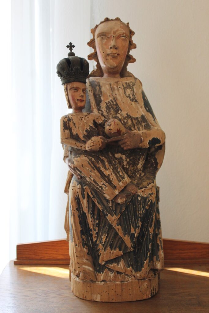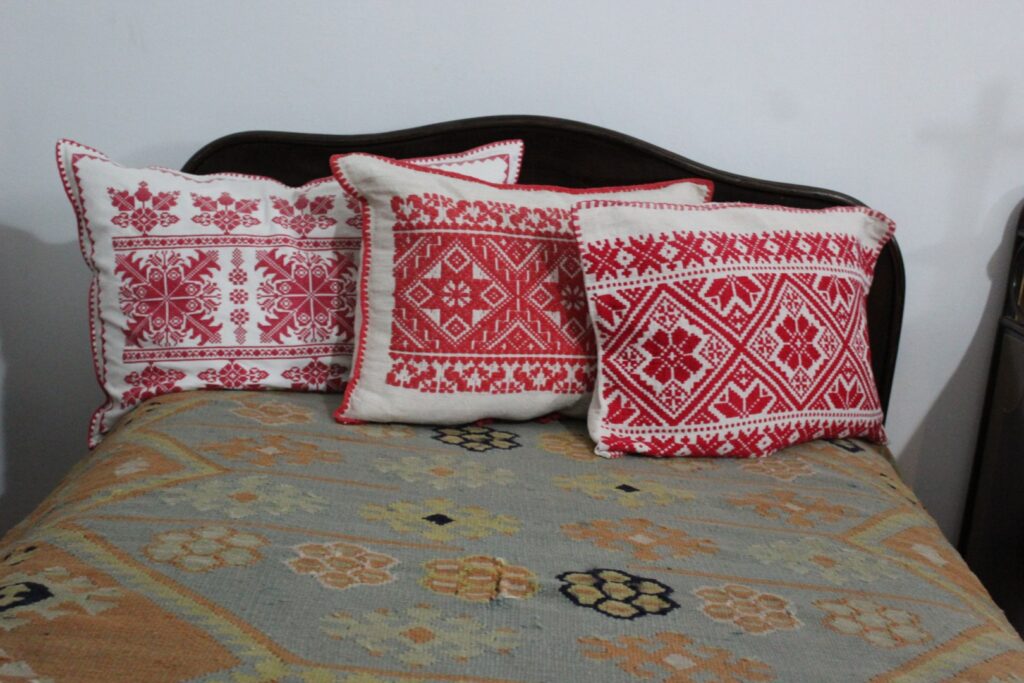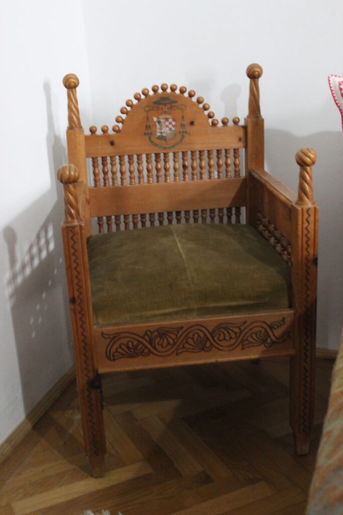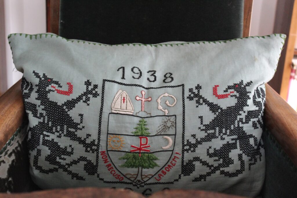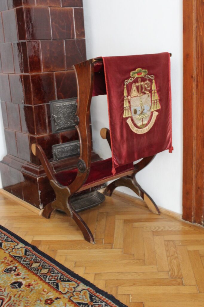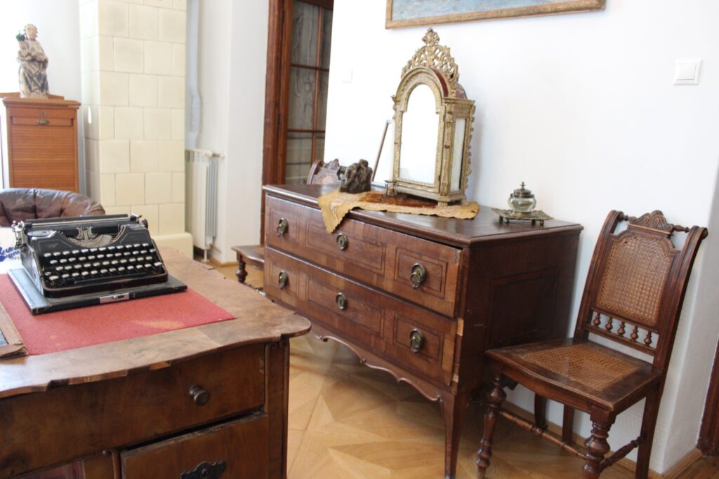 Ami engem külön megfogott, a két karosszék, ami a vendégek számára volt fenntartva. Nem újrakárpitozott, felújított és „olyan, mintha” ülőalkalmatosság, hanem olyan, amelyről rögtön megállapítottuk: ezek bizony mesélhetnének. Szívemnek külön kedves volt a széki hívektől kapott két hímzett párnahéj, egyiken egy kis szépséghibával; a hímző kifelejtette a két évszám közül a kötőjelet, és utólag egy függőleges vonallal pótolta azt. Valahogy mintha ráerősítene ez is arra, végtelenül emberi a történet, ami a használati tárgyak között és azok alapján kibontakozott szemünk előtt. A fali és padlószőnyegek, szekreterek, az írógép, a szülők fotója elhelyezve az íróasztalon… mintha mindjárt belépne az, akit e szerény, de mégis praktikus berendezés szolgál mindennapi munkájában.