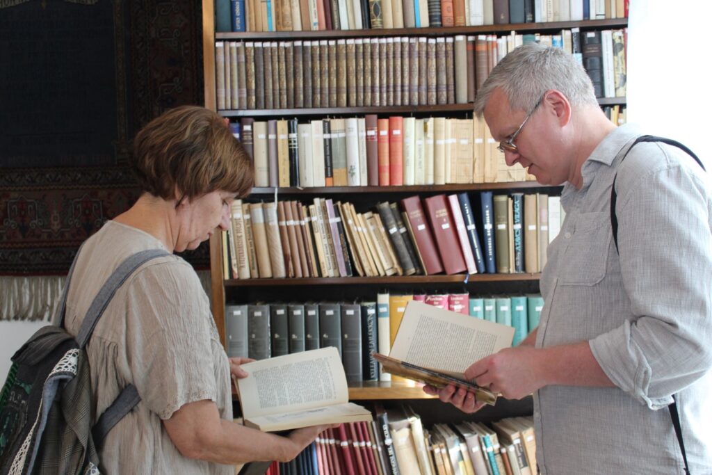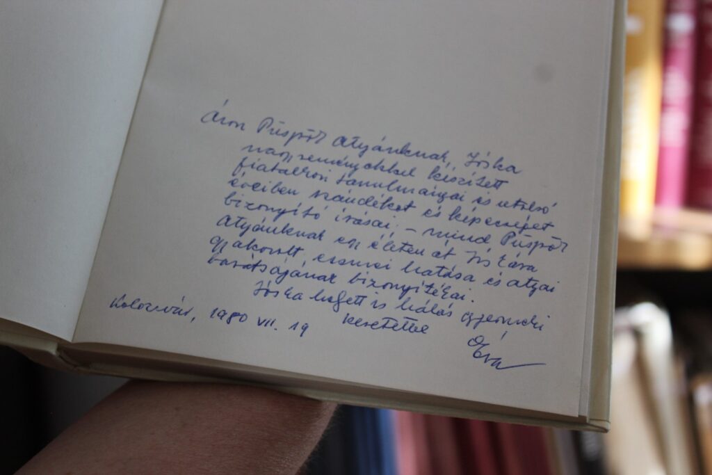 Mint afféle könyvszerető emberek, innen rögtön a dolgozószobába fordultunk be, ahol a könyvespolcok előtt igen sokat tátottuk a szánkat, nicsak, a Puszták népe! Nahát, az Önismeret útján Venczel Józseftől! Nocsak, a Faust! Itt egy dedikált példány, ott egy családi bejegyzéseket őrző kalendárium. Aztán a könyvespolcról hamar magára a dolgozószobára fordítottuk tekintetünket. Itt dolgozott tehát egykori püspökünk. Az egyszerű, és mai mércével szerény, de mégis reprezentatív berendezés tulajdonképpen lenyűgöző.