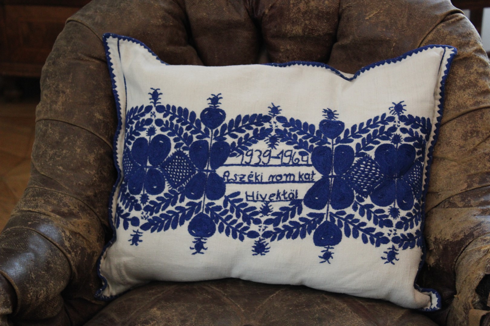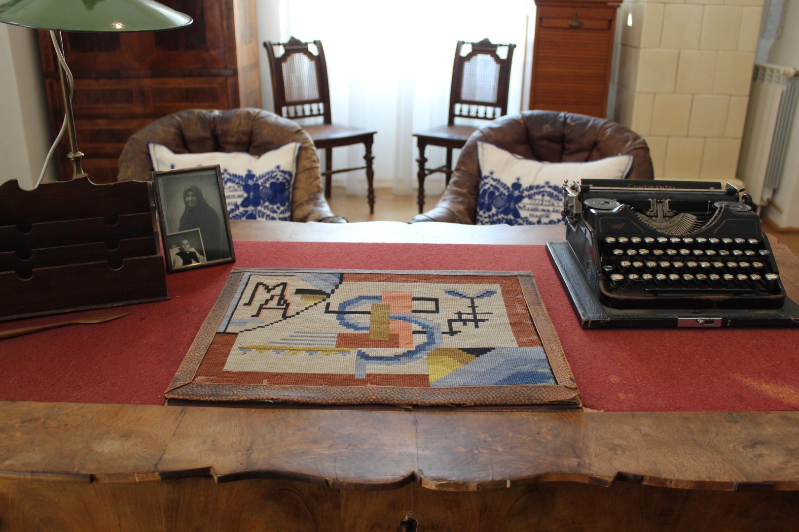Ami engem külön megfogott, a két karosszék, ami a vendégek számára volt fenntartva. Nem újrakárpitozott, felújított és „olyan, mintha” ülőalkalmatosság, hanem olyan, amelyről rögtön megállapítottuk: ezek bizony mesélhetnének. Szívemnek külön kedves volt a széki hívektől kapott két hímzett párnahéj, egyiken egy kis szépséghibával; a hímző kifelejtette a két évszám közül a kötőjelet, és utólag egy függőleges vonallal pótolta azt. Valahogy mintha ráerősítene ez is arra, végtelenül emberi a történet, ami a használati tárgyak között és azok alapján kibontakozott szemünk előtt. A fali és padlószőnyegek, szekreterek, az írógép, a szülők fotója elhelyezve az íróasztalon… mintha mindjárt belépne az, akit e szerény, de mégis praktikus berendezés szolgál mindennapi munkájában.