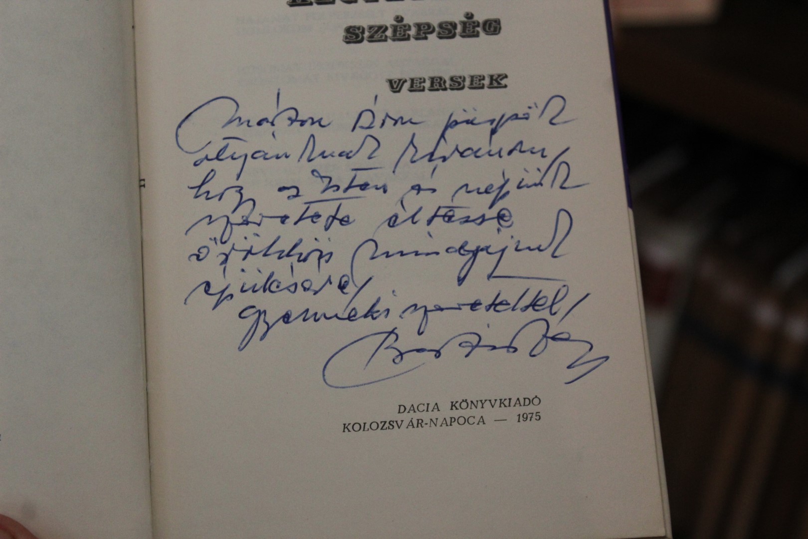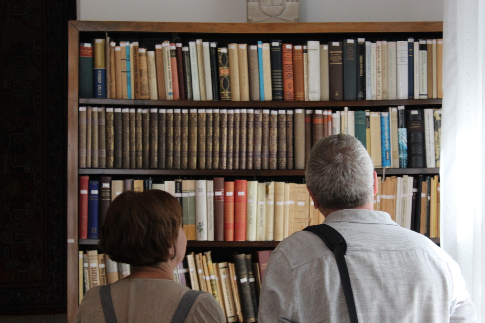 Mint afféle könyvszerető emberek, innen rögtön a dolgozószobába fordultunk be, ahol a könyvespolcok előtt igen sokat tátottuk a szánkat, nicsak, a Puszták népe! Nahát, az Önismeret útján Venczel Józseftől! Nocsak, a Faust! Itt egy dedikált példány, ott egy családi bejegyzéseket őrző kalendárium. Aztán a könyvespolcról hamar magára a dolgozószobára fordítottuk tekintetünket. Itt dolgozott tehát egykori püspökünk. Az egyszerű, és mai mércével szerény, de mégis reprezentatív berendezés tulajdonképpen lenyűgöző.