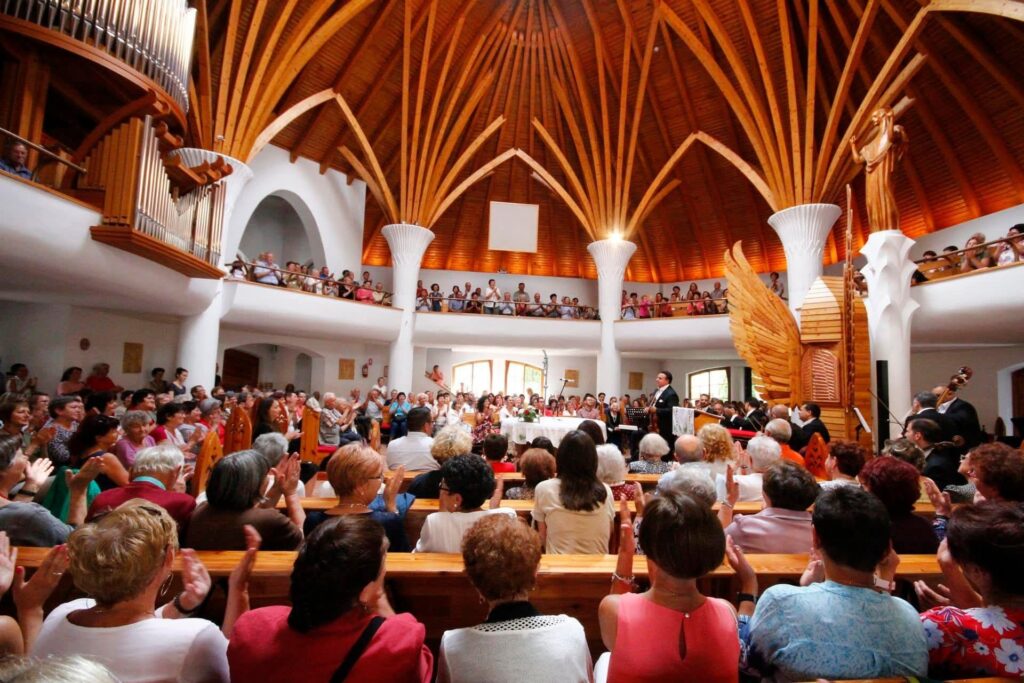 Ezt követően az Angyalos templomnak nevezett Millenniumi templom következett, amelynek kör alakja lekötötte a ministráns gyermekek figyelmét. Élvezettel hallgatták az oltár és a méhkaptár formájú szentségház bemutatását, majd a szablyára helyezett feltámadási szobor felfelé mutató alakját, amely Istent és a felebarátját szerető embernek örök boldogságot ígér. Élvezettel csodálták a látogatók a templom orgonáját, majd körüljárták a galériát, utána meg az alagsorban lévő kápolna és játszóház keltette fel érdeklődést. A kisebbek mindjárt játszani is kezdtek.