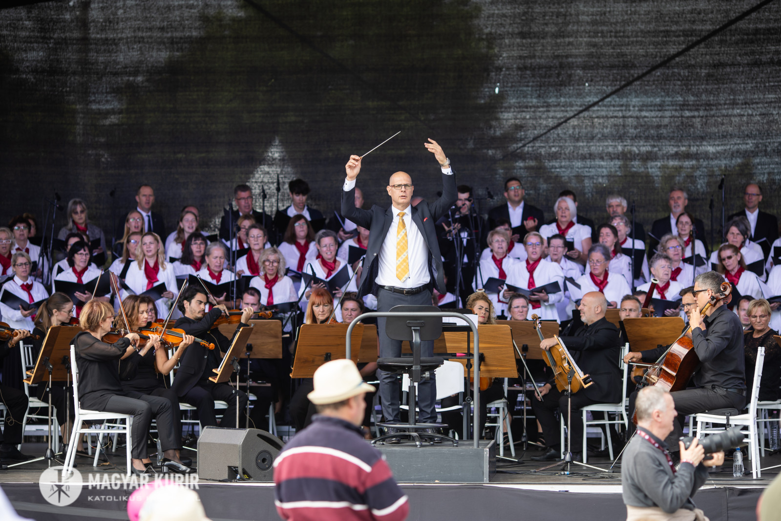 A zenei szolgálatot egy majdnem százfős ének- és zenekar végezte, melynek része volt a Mendelssohn Kamarazenekar, az Orlando Énekegyüttes és a Szent Mihály-főszékesegyház Kórusa, a Veszprémi Regina Mundi Plébánia Schoola Regina Kórusa, a Keszthelyi Karmelita Templom Kórusa. A művészeti vezetők Kovács Péter, Vikman Pál, Németh Kristóf, Szamosi Szabolcs voltak. Orgonán közreműködött Kovács Szilárd Ferenc, a pécsi bazilika orgonaművésze, akinek Werner Alajos Mercedes-mise átirata is elhangzott.