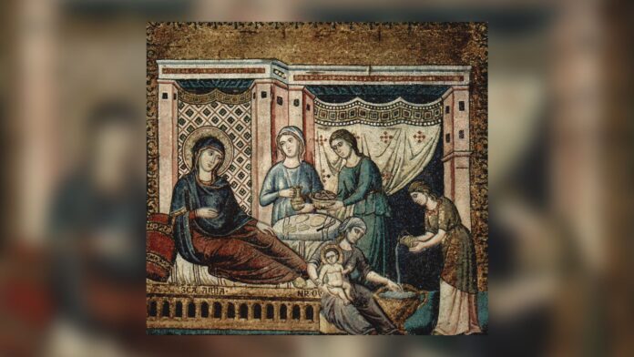 Az általunk bemutatandó alkotás Szűz Mária születésének körülményeit tárja elénk. A műalkotás a római Santa Maria in Trastevere-bazilikában található. A főalak itt Szent Anna, aki az ágyon ülve fogadja a szolgálók segítségét. Az ágy egy trónt juttathat eszünkbe, ahol az istenanya világra jött. A személyek azonosítását az alattuk olvasható feliratok teszik lehetővé. A szereplők közül csak Szent Anna és Mária viselnek glóriát, kiemelve szentségüket. A gyermek fürdetése a megtisztulás szimbóluma és egyszerre a keresztség előképe is. A kompozíciót a bensőségesség és melegség hatja át.