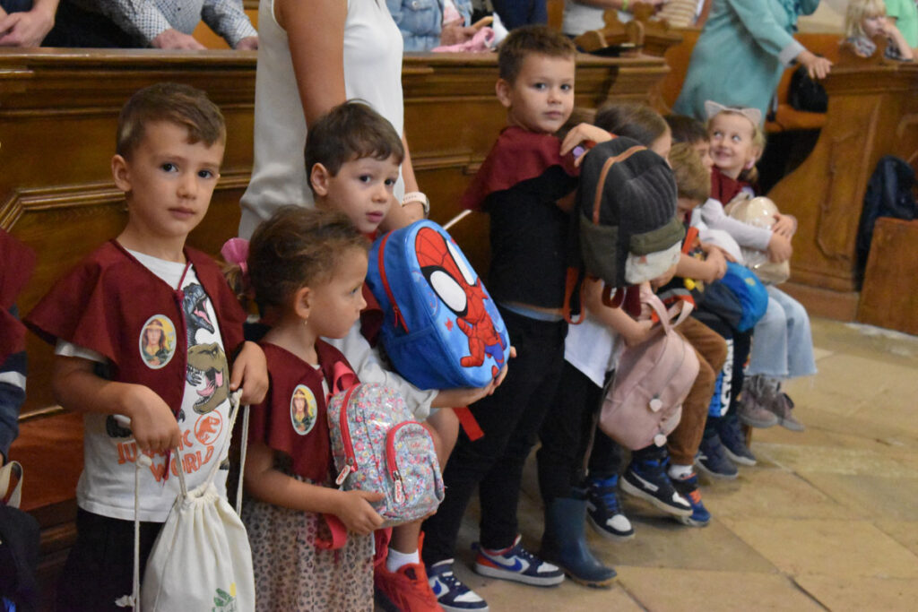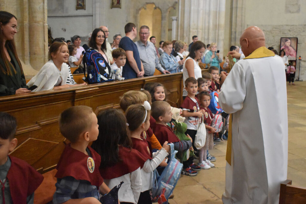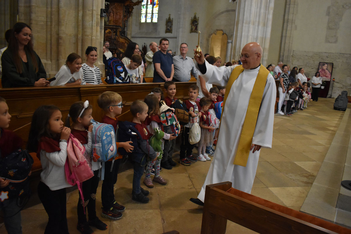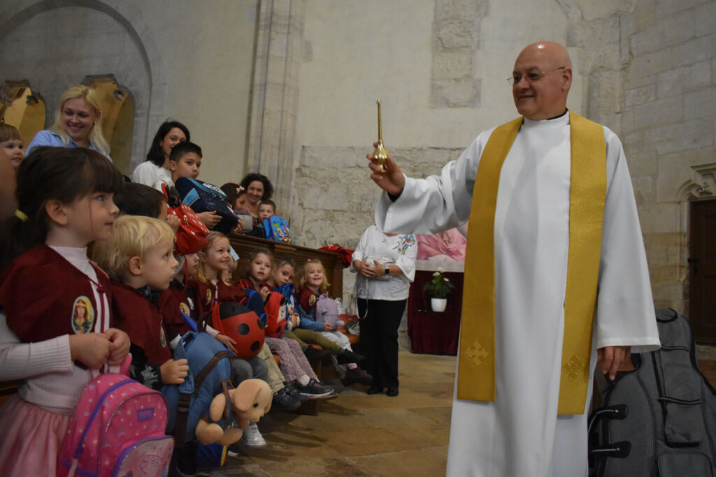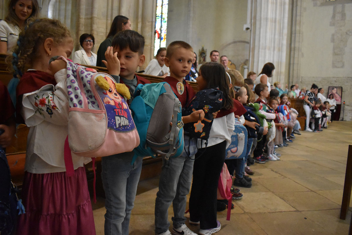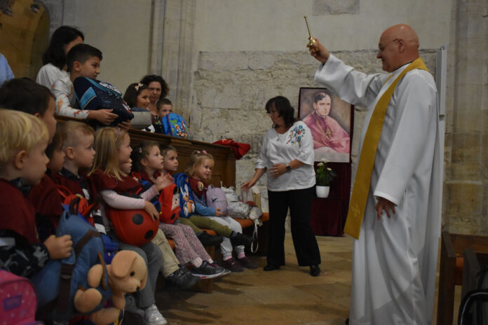 Izgatottan gyülekeztek a kisgyermekek szeptember 12-én, pénteken a kolozsvári Szent Imre Római Katolikus Óvoda udvarán. Az első óvodai hét lezárásaként a táskáik megáldására indultak el, hogy Isten oltalmát kérjék a tanév minden napjára. A Szent Mihály-templomban László Attila főesperes-plébános gitárral, énekszóval és történetekkel szólította meg a bölcsődéseket és óvodásokat. Arra hívta fel a kicsik figyelmét, hogy amikor a táskájukra áldást mond, valójában magukra a gyermekekre kéri a mennyei Atya oltalmát.