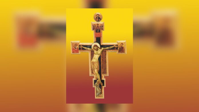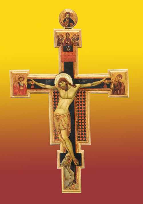 Az alkotás a halott Krisztust ábrázoló fára festett ikonszerű kereszt, amely a bizánci festészet elemeit idézi. A középpontban a kontraposztot lerajzoló Krisztus megfeszített teste látható, aki már kilehelte lelkét. Feje lehajtva, jobb oldalra fordulva, édesanyja, a Szűzanya felé. Jézus jobbján Szűz Mária tűnik fel, aki kendővel törli könnyeit. A balján János apostol, aki elkísérte egészen a keresztig. Mindkettejüket csak deréktól felfele, kezes portréként jelenítette meg az alkotó, így jól megfigyelhetőek gesztusaik, amelyek a megrendülésről és a hódolatról árulkodnak. A kereszt tövében Assisi Szent Ferenc jelenik meg, aki mint „második Krisztus” a szent sebhelyekkel együtt hódol Krisztusa előtt, és aki a történelemben elsőként viselte magán a stigmákat. A kompozíció felső részén szintén a Szűzanya jelenik meg két angyal kíséretében, de itt már mint mennybe felvett Királyné. Az Arezzói Szent Kereszt egyszerű kompozíciója azt a megfeszített Krisztust tárja elénk, aki előtt hódolattal borulhatunk le.