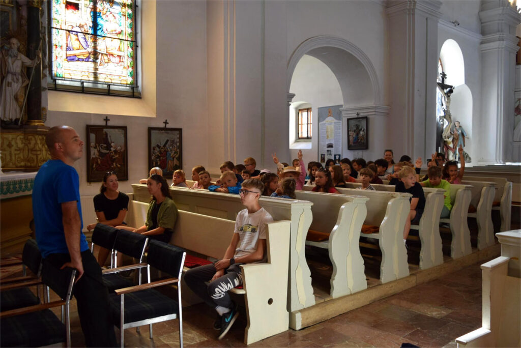 A csapat átvonult a Szent Miklós-templomba, ahol Fórika Sebestyén plébániai munkatárs tartott bemutatót, amelyben kiemelte a templom védőszentjét, Szent Miklós püspököt és Szent László királyt. Ebéd után a program négy helyszínen folytatódott: 1. beszélgetés a hallottakról, azok gyakorlatba ültetéséről; 2. Szent László játékok; 3. kézműveskedés, ahol koronák vagy kardok készültek; 4. a szenttel kapcsolatos legendák megismerése és szerepjáték betanulása.