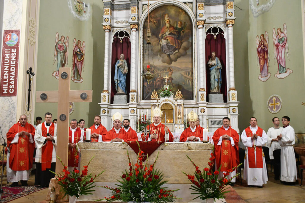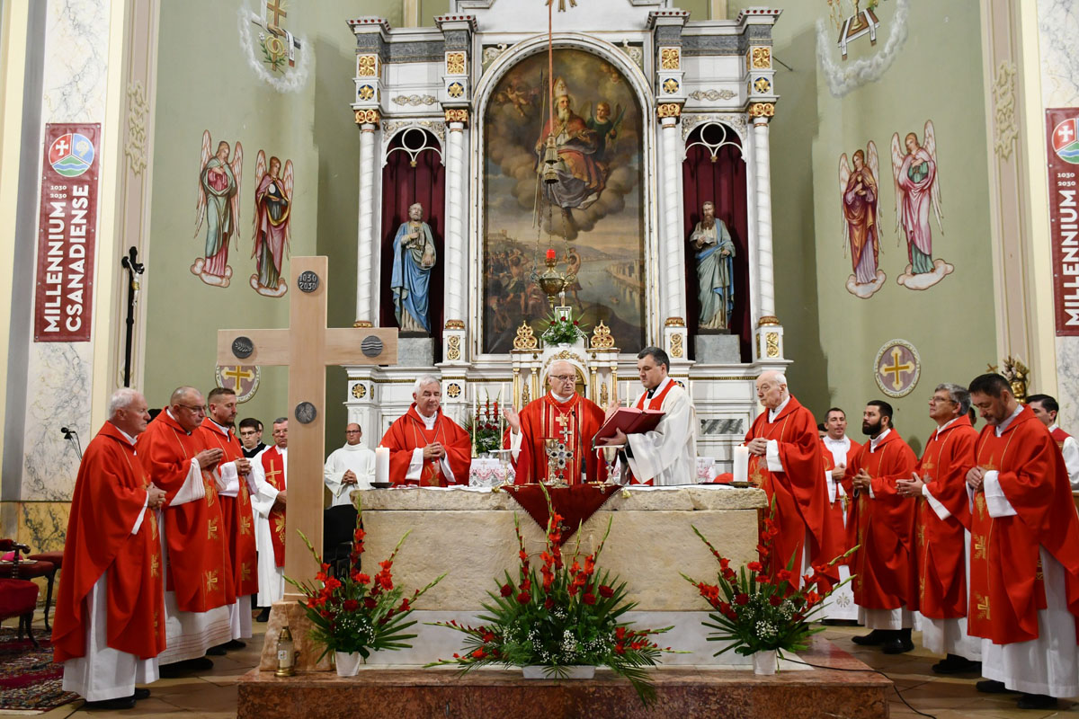 A szentmisén koncelebrált a szeged-csanádi egyházmegyéből Kovács József általános helynök, szemináriumi rektor, Serfőző Levente oktatási helynök Kondé Lajos pasztorális helynök, továbbá Gál Márton SDS, az Osztrák-Román Szalvatoriánus Rendtartomány elöljárója, valamint számos pap a temesvári és a szeged-csanádi egyházmegyéből. A templom padjait megtöltő zarándokokkal együtt érkezett Nagycsanádra a Magyar Máltai Szeretetszolgálat makói önkénteseinek csoportja is. A szentmise zenei szolgálatát a templomi kórus végezte, Kercsó Béla kántor vezetésével. A liturgián jelen volt egy fiatalokból álló csoport is magyar, német és bolgár népviseletben.