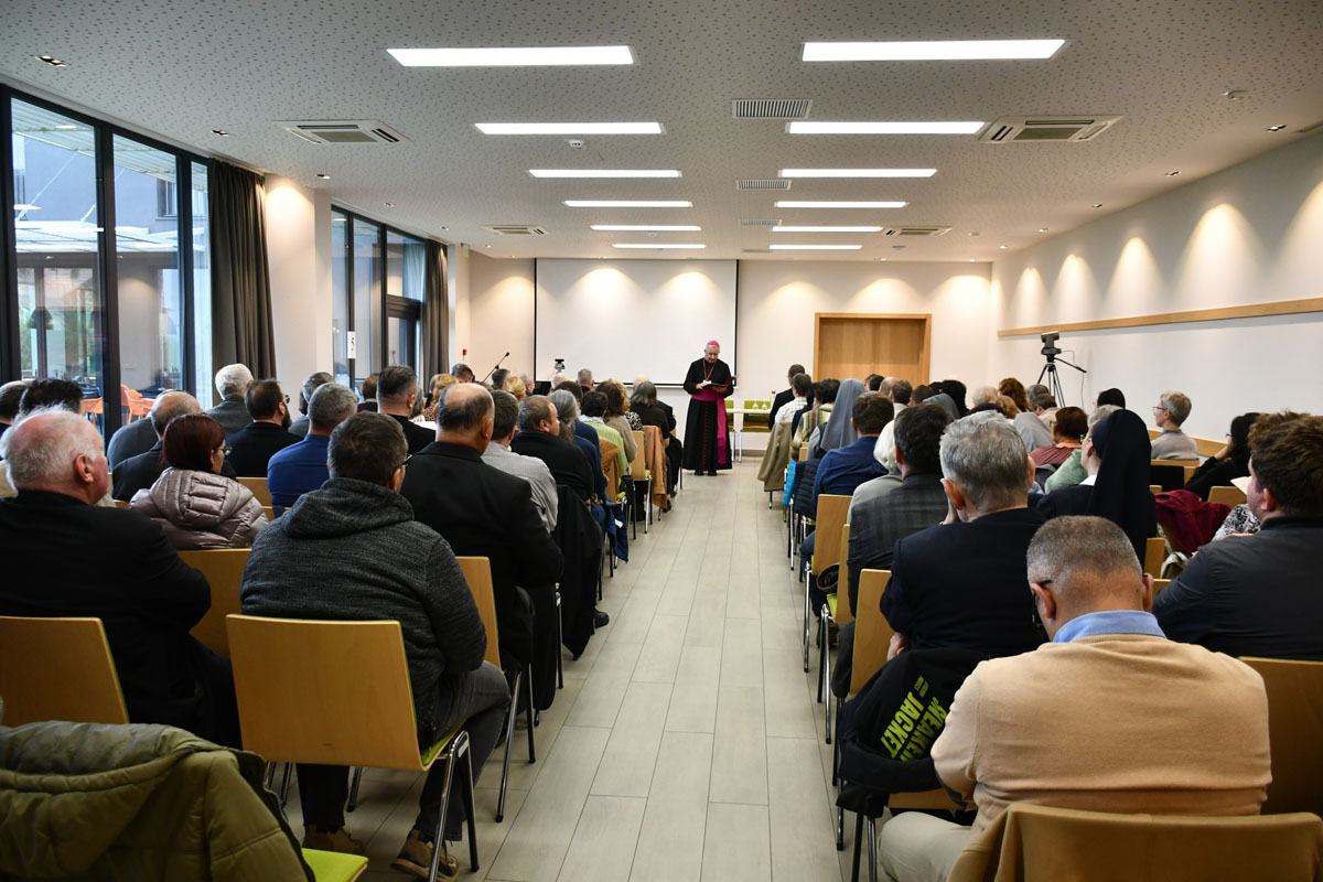 A megyés püspök beszédében hangsúlyozta, hogy ez a két téma rendkívül időszerű, hiszen a szinodalitás csak közösségben élhető meg. „Miért van szükség közösségekre, és miért jó egy közösséghez tartozni?” – tette fel a kérdést előadása elején az egyházmegye főpásztora, majd felsorolta a közösség néhány jellemzőjét: tagjai ismerik egymást, segítik egymást, imádságban élnek, fontos számukra az eucharisztia ünneplése, tudatosan élik karizmáikat, gondoskodnak az idősekről, a betegekről és a rászorulókról. „A nagy plébániai közösségeknek kis közösségekből kell állniuk, különben hol tudnánk megélni a szinodalitást, hol hallhatnánk együtt a Szentlélek hangját? És hogyan vinnénk tovább a küldetést?! A legutóbbi szinódus is váltakozó ritmusban zajlott: kis csoportos találkozók és nagy közös gyűlések váltották egymást. Először kis csoportokban beszélgettünk, megpróbáltuk megélni, amit megvitattunk, és csak ezután osztottuk meg a beszélgetések eredményét a gyűlés többi tagjával. Szervezési szempontból is előnyös, ha a plébániák kisebb közösségekre oszlanak. Amikor panaszkodunk, hogy kevesen járnak templomba, könnyű azt mondani: a többiek elvándoroltak. Ez csak az igazság egyik része. Valóban sokan külföldre vagy nagyvárosokba költöztek, de sokan még mindig itt vannak – csak éppen »elvándoroltak« a templomtól vagy a közösségtől. Gyakran első okként említjük azt, amire nincs ráhatásunk: az elvándorlást. A kérdés az: mit tehetünk azokért, akik itt vannak, jelen vannak, hogy egyre mélyebben gyökerezzenek Krisztusban?” – fogalmazott a megyés püspök.