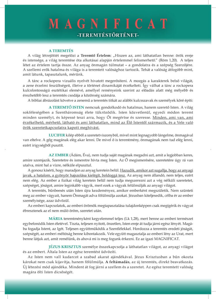 A Magnificat – Teremtéstörténet című rockopera megújult formában tér vissza, kibővített zenei világgal és frissített hangszerelésekkel gazdagítva az élményt. Témája a klasszikus teremtéstörténet. Célja rávilágítani a bűn roncsoló hatalmára, felébreszteni a csodálatot Isten és a teremtett világ iránt.