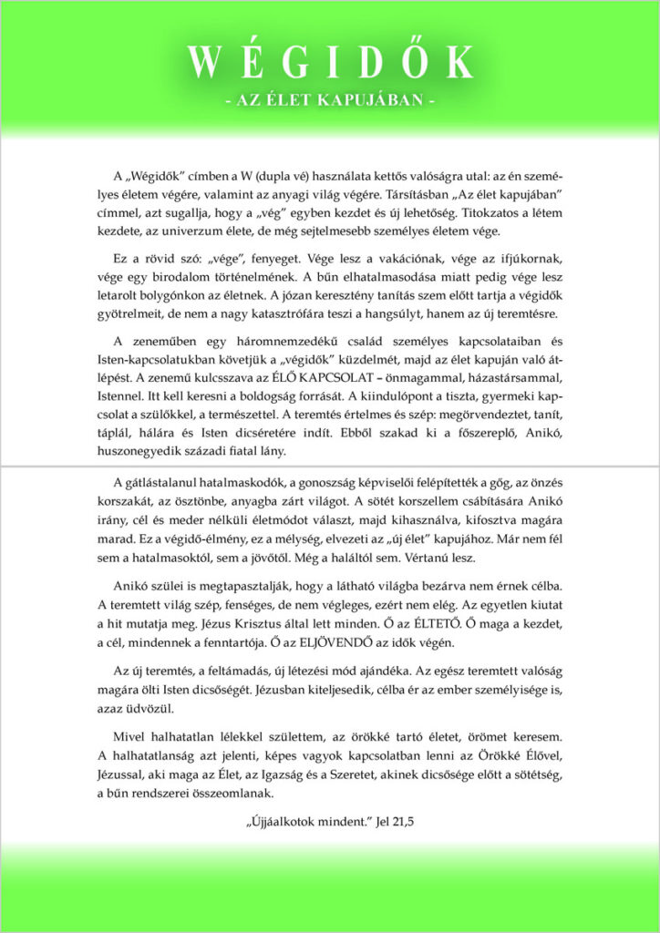 A Wégidők – Az élet kapujábanrockopera ősbemutatójára is sor kerül. A teremtés értelmes és szép: megörvendeztet, tanít, táplál, hálára és Isten dicséretére indít. Ebből szakítja ki magát a főszereplő, Anikó, a huszonegyedik századi fiatal lány. A sötét korszellem csábítására irány, cél és meder nélküli életmódot választ, majd kihasználva, kifosztva magára marad. Ez a végidőélmény, mélység, elvezeti az „új élet” kapujához.