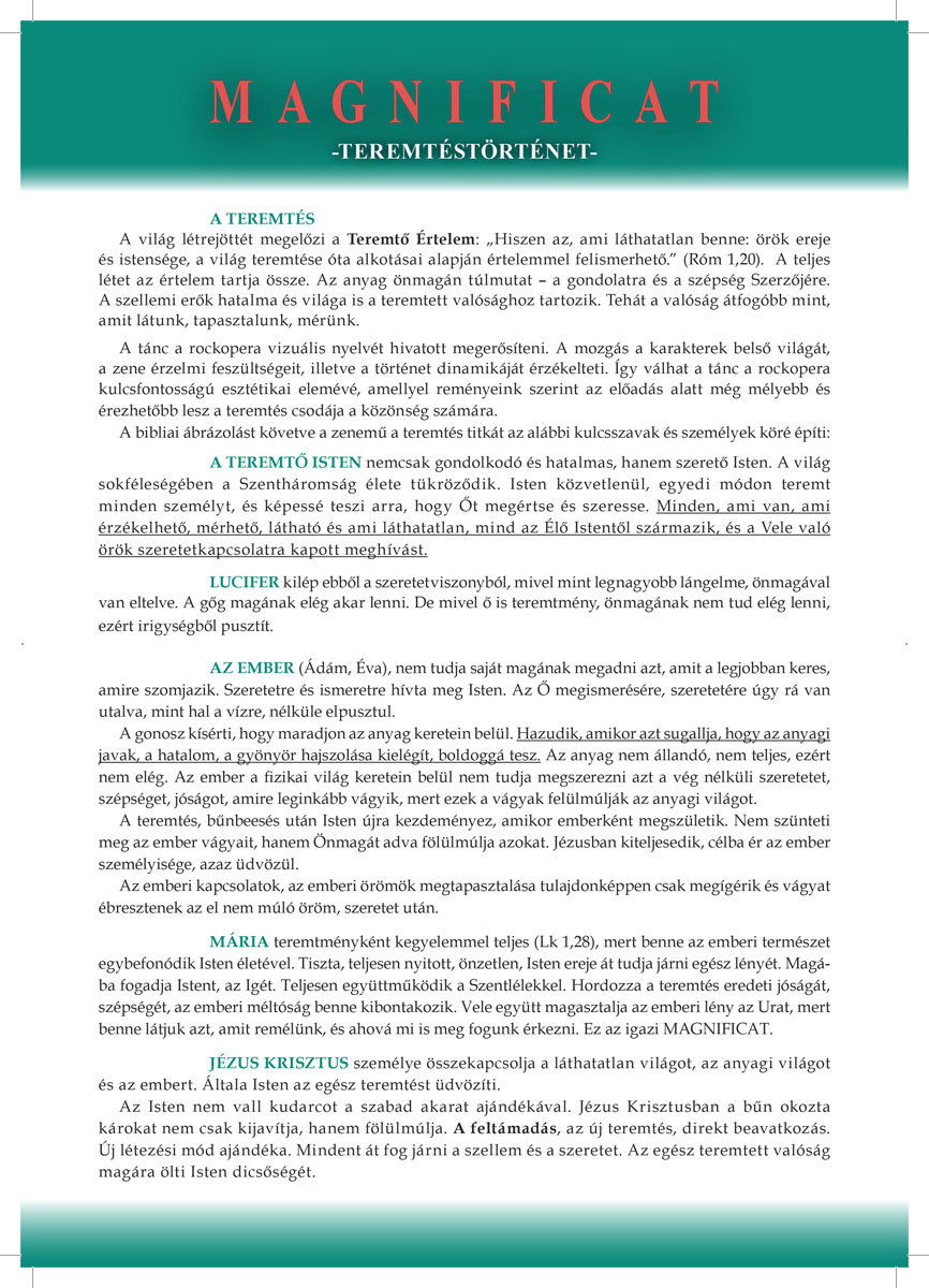 A Magnificat – Teremtéstörténet című rockopera megújult formában tér vissza, kibővített zenei világgal és frissített hangszerelésekkel gazdagítva az élményt. Témája a klasszikus teremtéstörténet. Célja rávilágítani a bűn roncsoló hatalmára, felébreszteni a csodálatot Isten és a teremtett világ iránt.