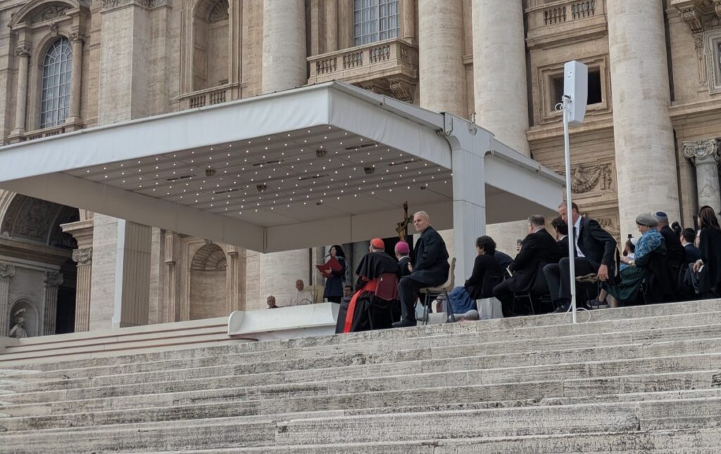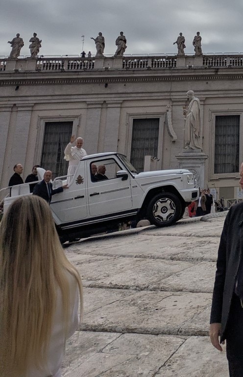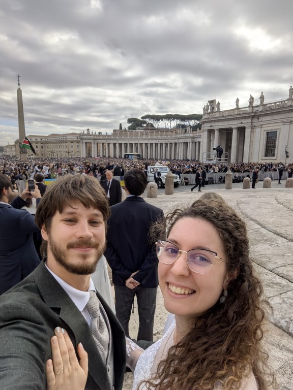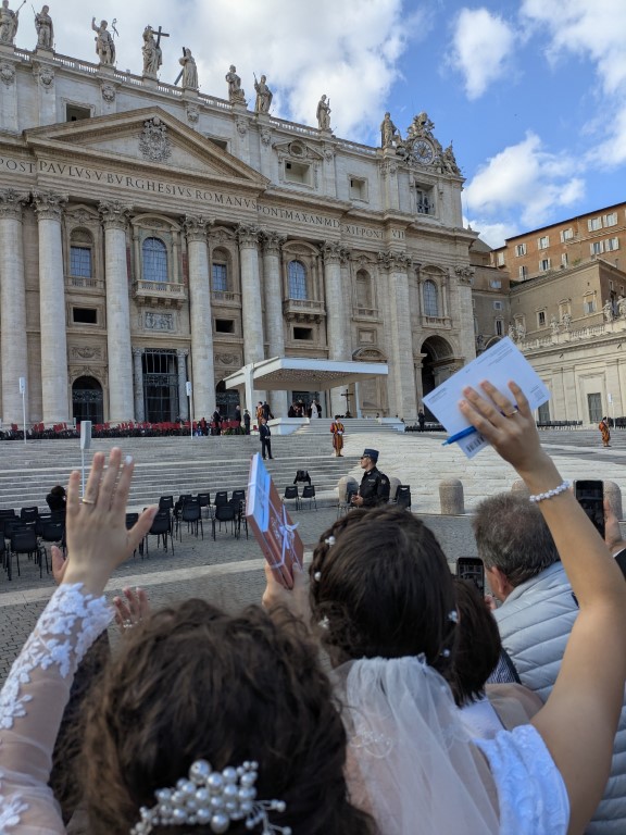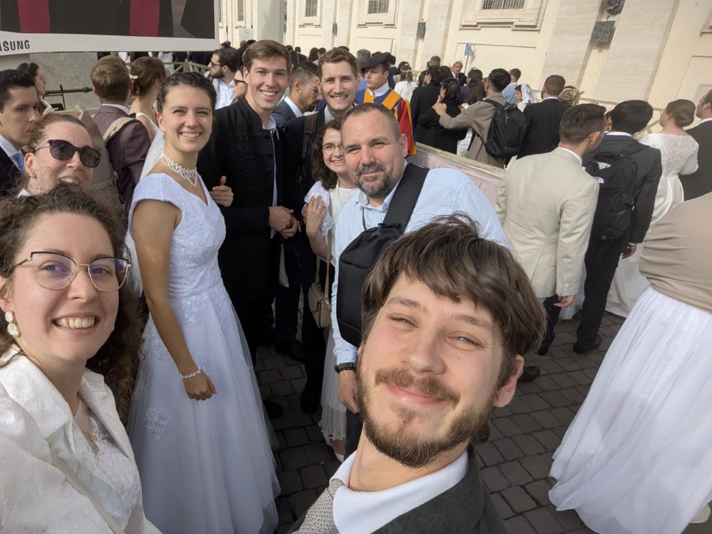 Annyi mártírszent sírját és templomát meglátogatva, közbenjárásukat kérve már igencsak áradt a kegyelem, s ennek megkoronázásaként friss házasokként (sposi novelli) voltunk jelen a múlt szerdai audiencián. A reggel hét órától gyarapodó sor kiállása után a svájci gárdisták már mind egyértelműen a Szent Péter téren felállított színpad elé, kissé jobbra irányítottak, időközben pedig annyian lettünk, távolról is egyértelműen felismerhetően, hogy a bal oldali részen még egy sposi novelli csapat alakult. Helyet foglaltunk, izgatottan figyelve és várakozva, rózsafüzéreket szorongatva. Franciák, németek, magyarok, amerikaiak, spanyolok, portugálok és persze olaszok, sőt, ennél jóval több nemzet is eljöhetett, hiszen száznál is több sposi novelli volt jelen aznap – elképesztő látvány és élmény! Bárcsak mindenkivel beszélhettünk volna, bárcsak még többek szívébe beleláthattunk volna. De az arcok így is oly sokat elárultak. Néhány fotó, néhány pillanat, égi erőbe kapaszkodás, és be is gurult a térre… A pápamobil, Leó pápával. Az elsők között a házaspárok csoportjához látogatott el. Jelenléte, szeretete és buzdító tekintete megerősítő volt.
