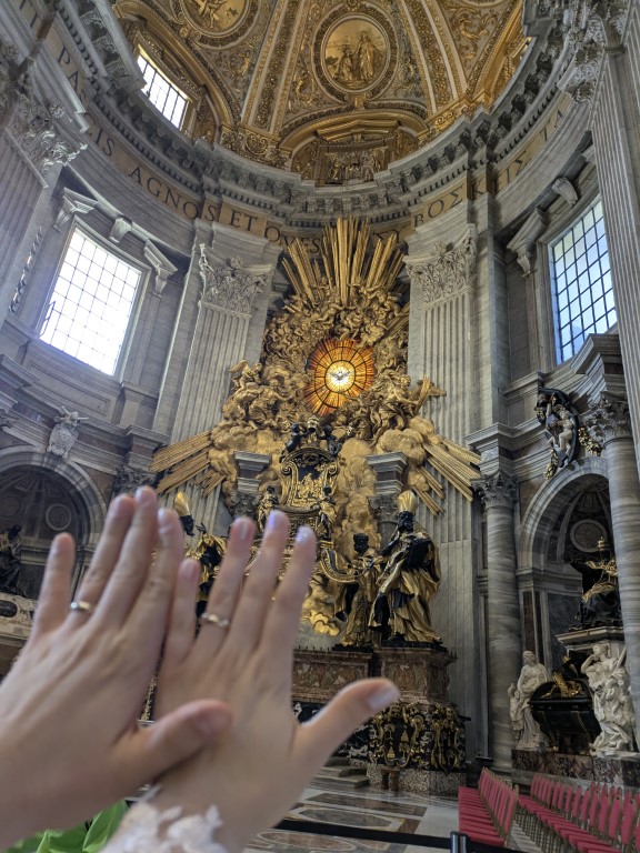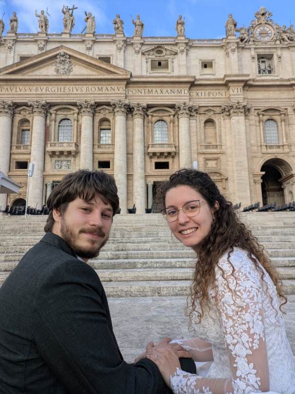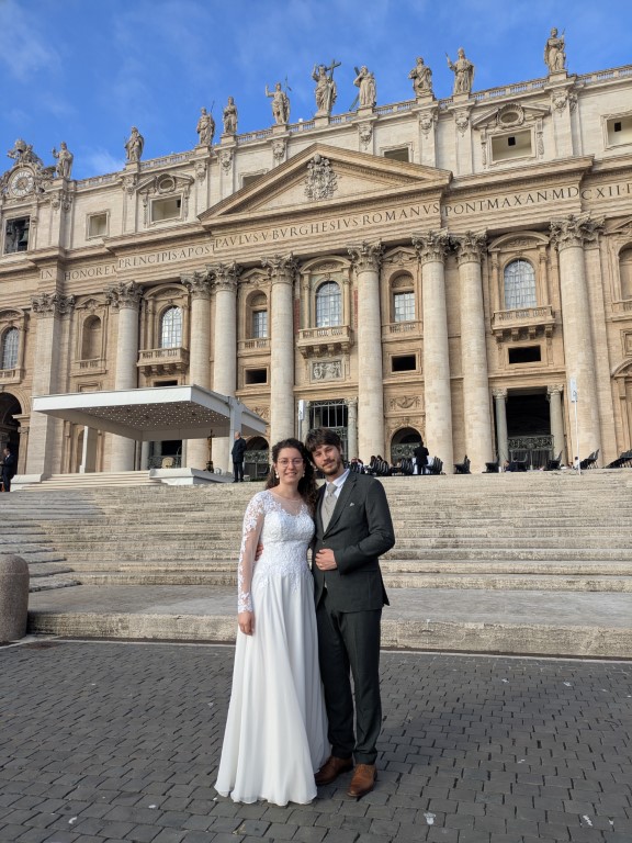Zárásképp a híveket üdvözlő gondolatai végén Simon és Taddeus Júdás apostolokra hivatkozó buzdítással fordult felénk: „példájuk (…) segítsen nektek, friss házasok, hogy családotokat Isten és testvéreitek szeretetének találkozási helyévé tegyétek”. Igazi lelki útravaló házasságunk kezdetén. Majd következett az apostoli áldás és a Miatyánk eléneklése latinul, mely becsengte a teret. Lassan elkezdtek kifelé terelni minket, de akkor még nem tudtuk, hogy két meglepetés is vár ránk. Az első, hogy magyar hangokra lettünk figyelmesek. Megtaláltuk egymást, négy magyar pár. A második, hatalmas örömünkre, hogy elsőkként minket, friss házasokat engedtek be a jubileumi szent kapun a Szent Péter-bazilikába, ahol ritkaságszámba menő békés csend fogadta a nászünneplőbe öltözött párok imádságait. A csend mögött ott volt a Szentháromság vigyázó tekintete, aki végigkísérte ezt a sok kapcsolatot, jegyességet és megáldja a kibontakozó házasságokat.