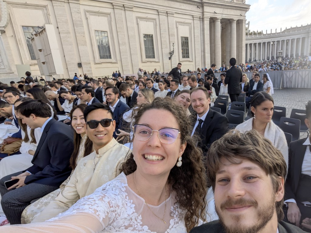 Annyi mártírszent sírját és templomát meglátogatva, közbenjárásukat kérve már igencsak áradt a kegyelem, s ennek megkoronázásaként friss házasokként (sposi novelli) voltunk jelen a múlt szerdai audiencián. A reggel hét órától gyarapodó sor kiállása után a svájci gárdisták már mind egyértelműen a Szent Péter téren felállított színpad elé, kissé jobbra irányítottak, időközben pedig annyian lettünk, távolról is egyértelműen felismerhetően, hogy a bal oldali részen még egy sposi novelli csapat alakult. Helyet foglaltunk, izgatottan figyelve és várakozva, rózsafüzéreket szorongatva. Franciák, németek, magyarok, amerikaiak, spanyolok, portugálok és persze olaszok, sőt, ennél jóval több nemzet is eljöhetett, hiszen száznál is több sposi novelli volt jelen aznap – elképesztő látvány és élmény! Bárcsak mindenkivel beszélhettünk volna, bárcsak még többek szívébe beleláthattunk volna. De az arcok így is oly sokat elárultak. Néhány fotó, néhány pillanat, égi erőbe kapaszkodás, és be is gurult a térre… A pápamobil, Leó pápával. Az elsők között a házaspárok csoportjához látogatott el. Jelenléte, szeretete és buzdító tekintete megerősítő volt.
