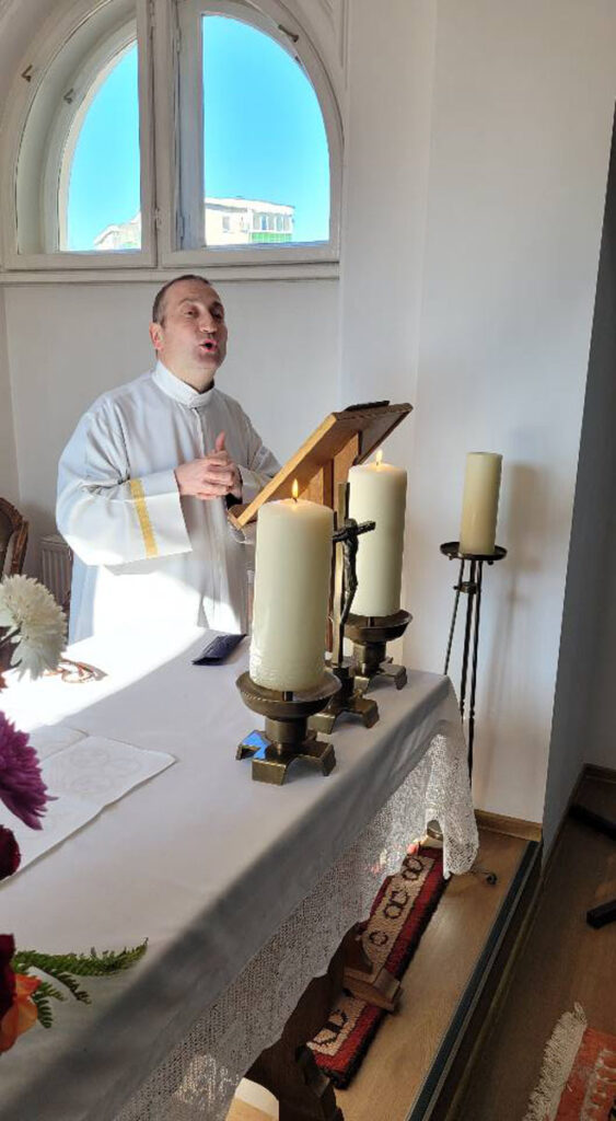 A tanúságtételeket szentmise követte a Caritas-székház kápolnájában, amelynek keretében Vass Csaba a vincés rendi nővérek által kórházként létrehozott épület kezdeteire is reflektált. 1930-ban adódott a vincés nővérek számára lehetőség, hogy kórházat alapítsanak a püspökség és a káptalan támogatásával, és egy év alatt építették fel a „kis Benjamint” – ahogy ők becézték az épületet. 1932. január 16-án kapták meg az államtól a működési engedélyt és nyolc nappal később megtörtént a Szent József-magánkórház felszentelése. Délelőtt 11 órakor volt az ünnepség, több mint 150 vendéggel. 1945–47-es jegyzőkönyvek tanúsága szerint még tizenöt évvel később is fizették a kórház részleteit a nővérek, amely nem kis elköteleződést igényelt – emlékeztetett Vass Csaba lazarista szerzetes.