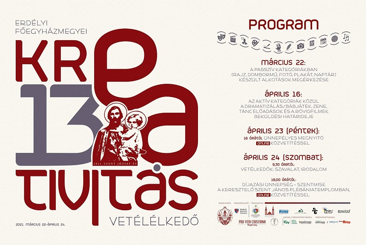 Az Erdélyi Főegyházmegyei Kreativitás vetélkedő 14 versenykategóriában (rajz, fotó, naptár, plakát, dombormű/körplasztika, irodalom, szavalat, bábjáték/dramatizálás, rövidfilm, vokális és hangszeres zene, tánc, nyilvános beszéd és pszichológia, angol nyelvű kisfilm és sport). A vetélkedőre Marosvásárhelyen, a Római Katolikus Líceum és a Keresztelő Szent János Plébánia / Pro Vita Cristiana Alapítvány szervezésében kerül sor 2026. április 24-25-én.