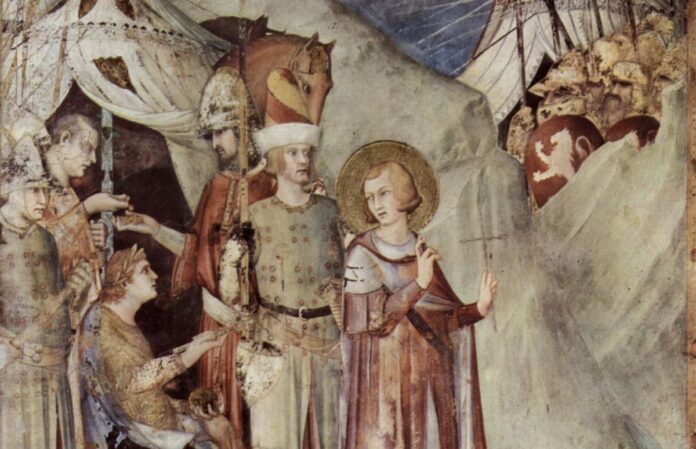 A freskó Assisiben a Szent Ferenc-bazilika altemplomának kereszthajóját díszíti egy olyan sorozat részeként, amelyen Márton élettörténetét láthatjuk. Az általunk elemzett részlet egy katonai tábort mutat be, ahol előkelőségek, katonák és maga a császár is megjelenik, hangsúlyozva a pompát és a rangot, amelyet Márton hátrahagyott. Mivel apja a római légióban szolgált, így rá is ez az életút várt, amelynek a kezdetekben engedelmeskedett is. Megtérése után azonban immár csak Krisztus katonájaként akart élni. A jól ismert harcos ábrázolásokkal ellentétben itt egy fiatalembert láthatunk, aki a kereszttel a kezében más irányba halad, mint a körülötte állók, bemutatva a keresztény életeszményt, amely tulajdonképpen nem más, mint az árral szemben haladni.