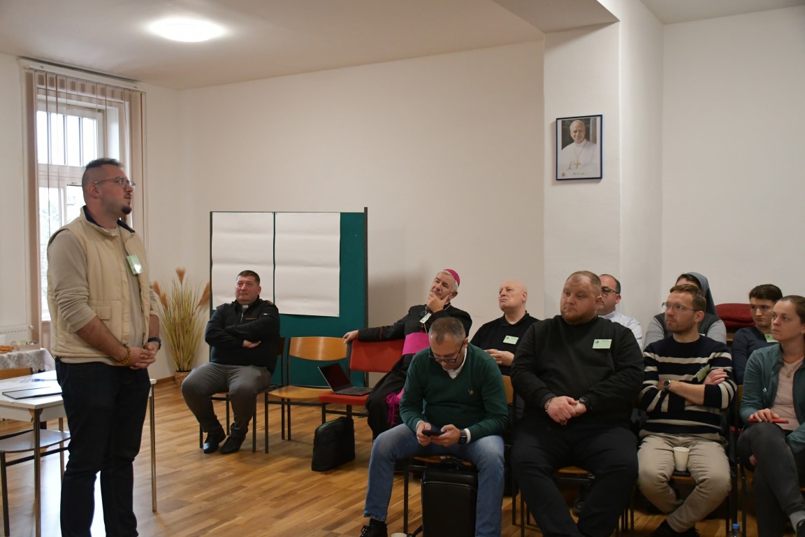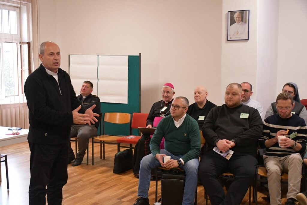 Az esemény örömteli és meghitt pillanattal kezdődött: a jelenlévők köszöntötték Johann Dirschl általános helynököt a születésnapja alkalmából, kifejezve hálájukat és elismerésüket a szolgálatáért. A résztvevők bemutatkozását követően interaktív előadás következett, amelyet Majoros Tibor állandó diakónus tartott, és elsőként a NIK – Nagyváradi Ifjúsági Vezetőképző programot mutatta be. „Ennek során két olyan témát is érinthetünk, amelyek hasznosak lehetnek az önök ifjúsági pasztorális szolgálatában: a kiscsoportokról és a tanúságtételről – hangsúlyozta a meghívott, majd folytatta: A 2000-es évek elején evangelizációba kezdtünk. A fiatalok száma növekedett. És felmerült a következő kérdés: Mi történik azzal a fiatallal, akit megszólítottuk? Ha nincs utókövetés, folytatás, plébániai támogatás, akkor visszatér oda, ahol korábban valami pozitívat tapasztalt Isten keresésében. Mi pedig csak egy maroknyi önkéntes voltunk. Láttuk, hogy német barátaink nagyszabású képzéseket szerveznek ifjúsági csoportvezetők számára. Mi is kezdtünk részt venni ilyen képzéseken, majd idővel mi magunk is szerveztünk hasonló alkalmakat fiatalok számára. Ebből a kezdeményezésből született meg később a gyulafehérvári főegyházmegyében a Teljes Szívvel ifjúsági csoportvezető képzés, amelyen jelenleg több mint 100 fiatal vesz részt. Két évvel ezelőtt indítottuk el a NIK-et, vagyis a Nagyváradi Ifjúsági Vezetőképzőt. Jelenleg 39 fiatal fejezi be ezt a képzést” – foglalta össze a tevékenységet a meghívott előadó, majd részletesen és mélyrehatóan foglalkozott az ifjúsági csoportvezetők képzésének témájával. Számos saját ötletet és tapasztalatot osztott meg annak érdekében, hogy a kiscsoportos beszélgetések résztvevői ne negatív gyakorlatként tekintsenek a találkozóknak ezen formájára, hanem a lelki feltöltődés és a hitben való növekedés lehetőségét lássák ezekben.