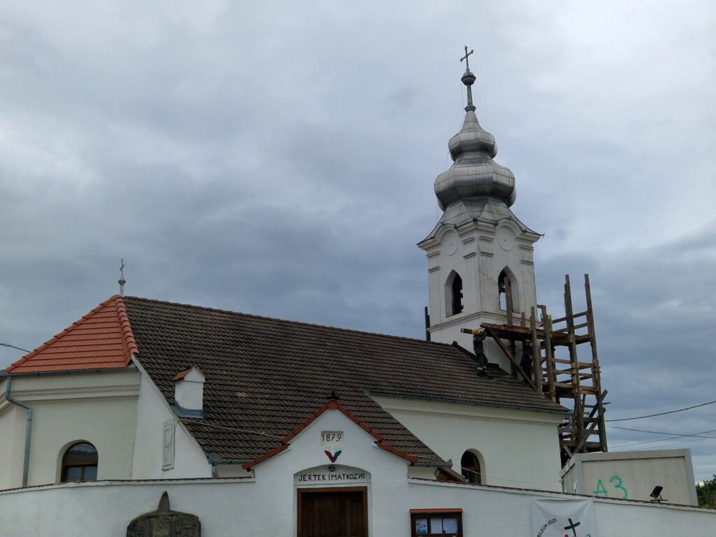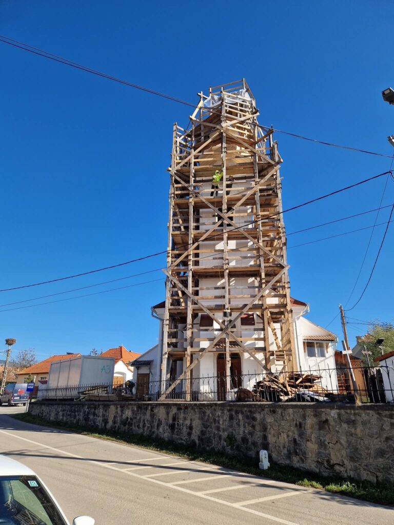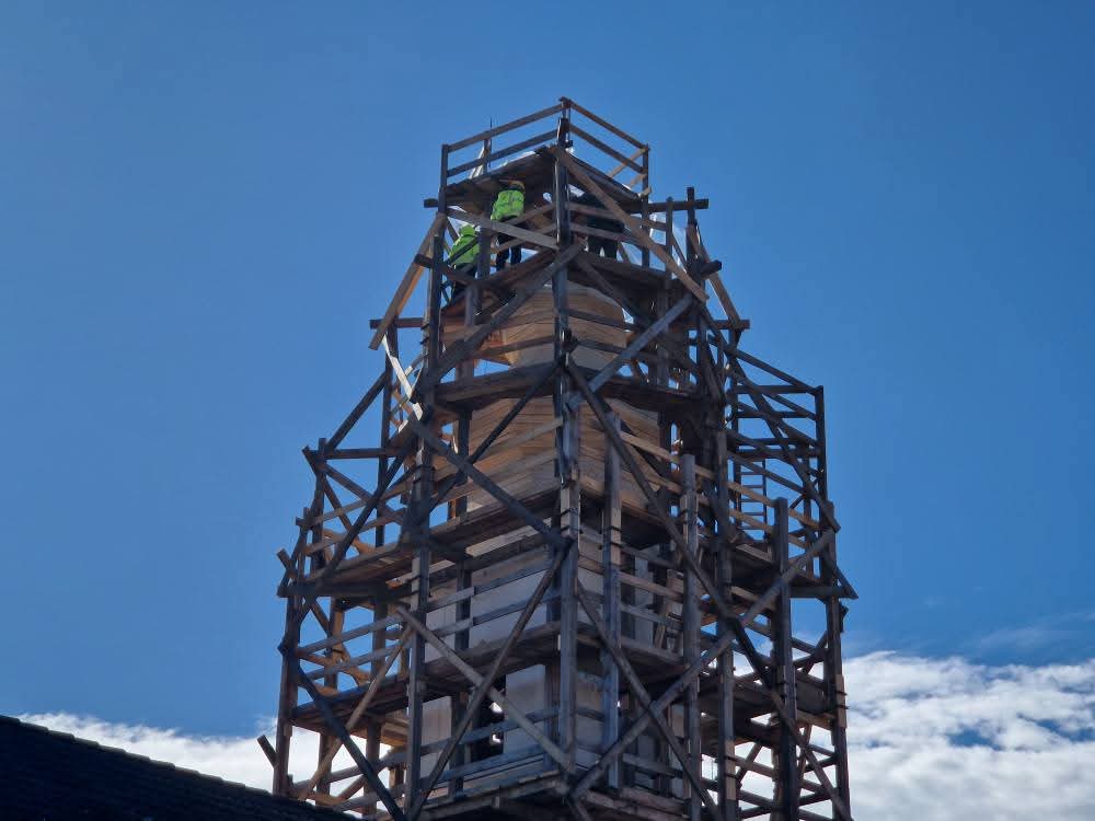 A munkálatok a torony felállványozásával kezdődtek, majd a toronysisak lemezének, villámhárítónak, keresztnek és a sisak faanyagának lebontásával folytatódott. Az ácsok jól haladtak, újjáépítették a toronysisak szerkezetét, a bádogosok a lemezfödéssel dolgoznak. A kőművesek a torony falának tisztítását, vakolását végzik.