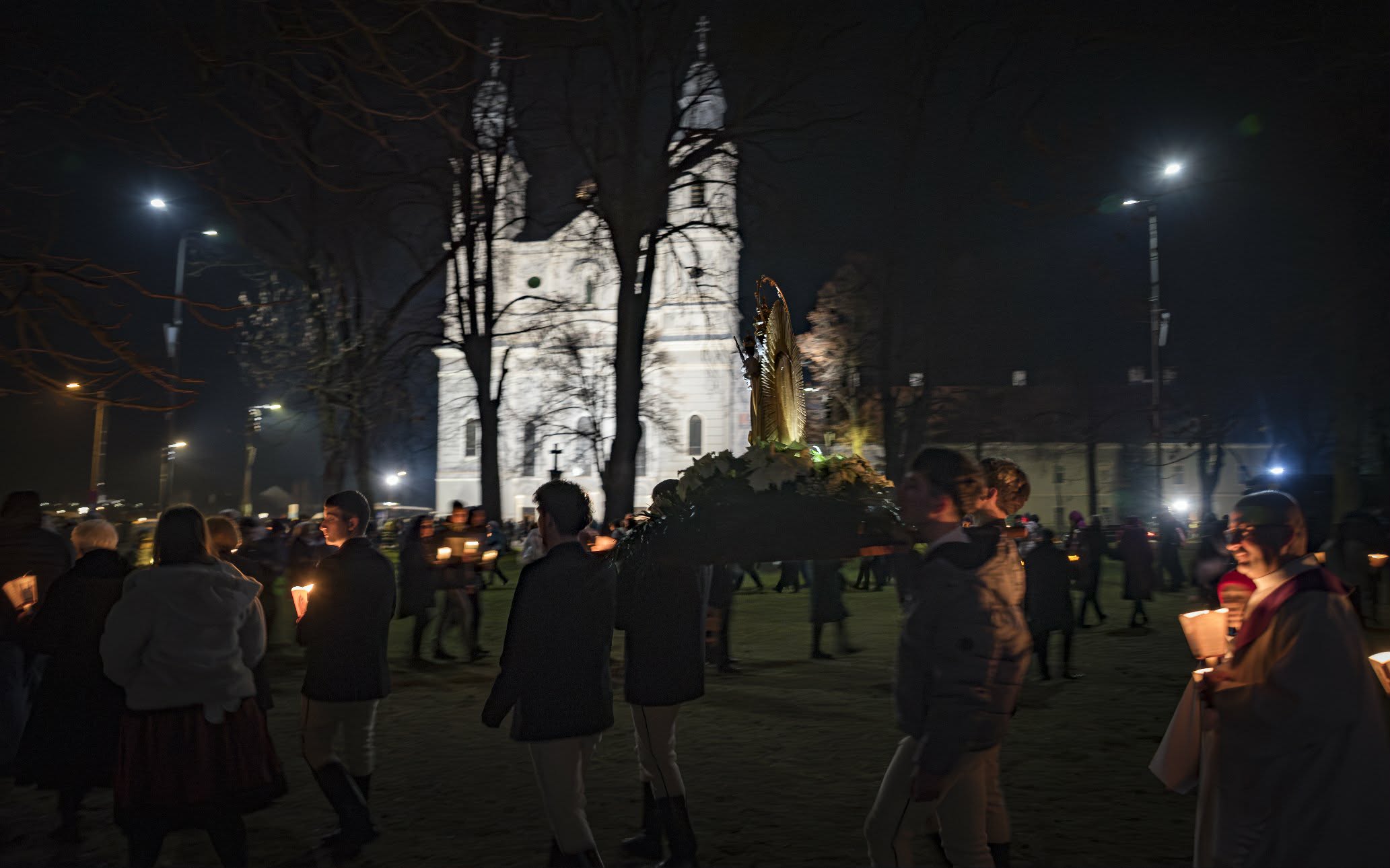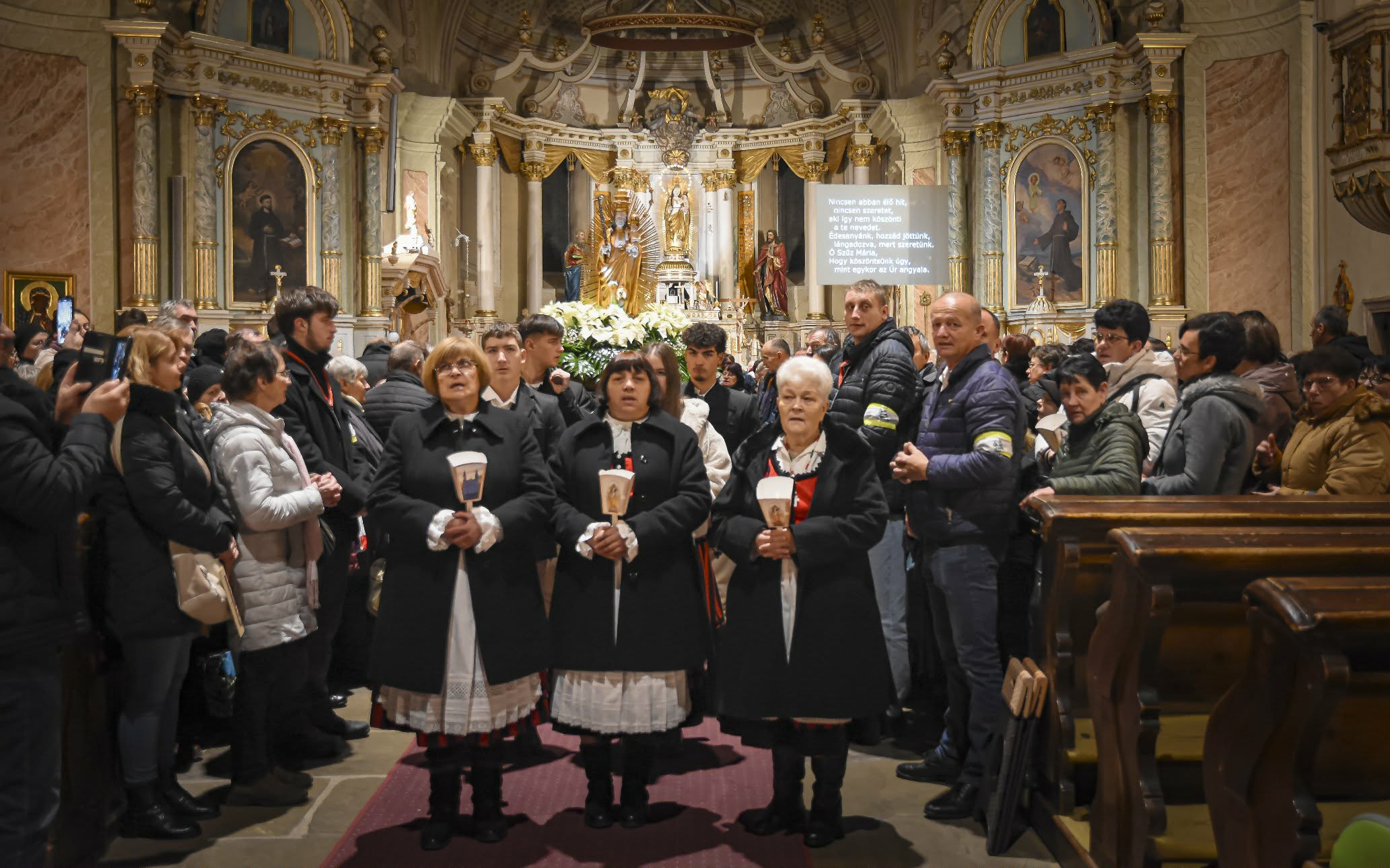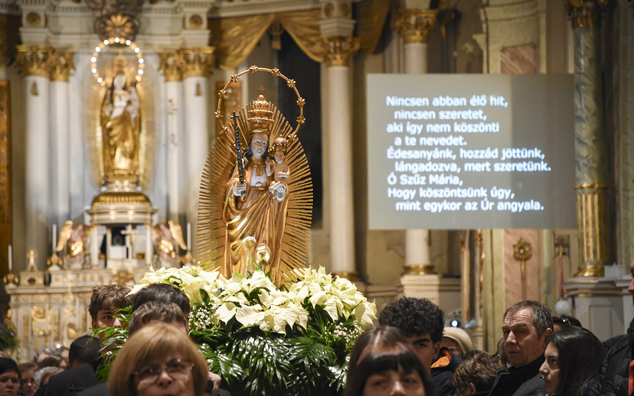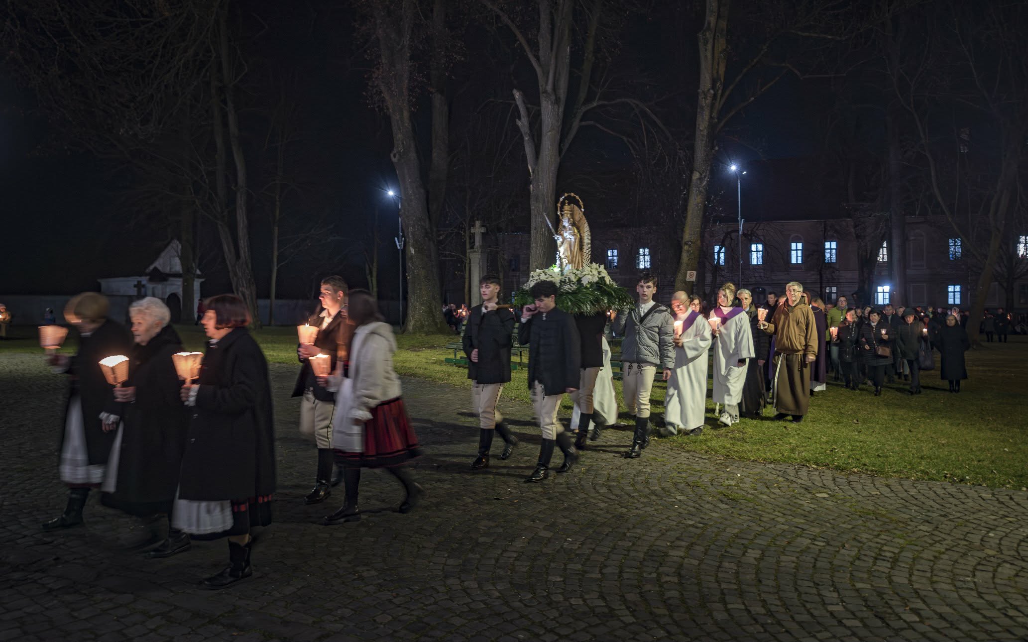 A gyertyás körmenetben ugyancsak a népviseletbe öltözött fiatalok vitték a Szűzanya kegyszobrának másolatát. Az elsőszombati Mária-köszöntőt a Mária Rádió és a kegyhely YouTube-csatornája élőben közvetítette. A következő Mária-köszöntő január 3-án lesz.