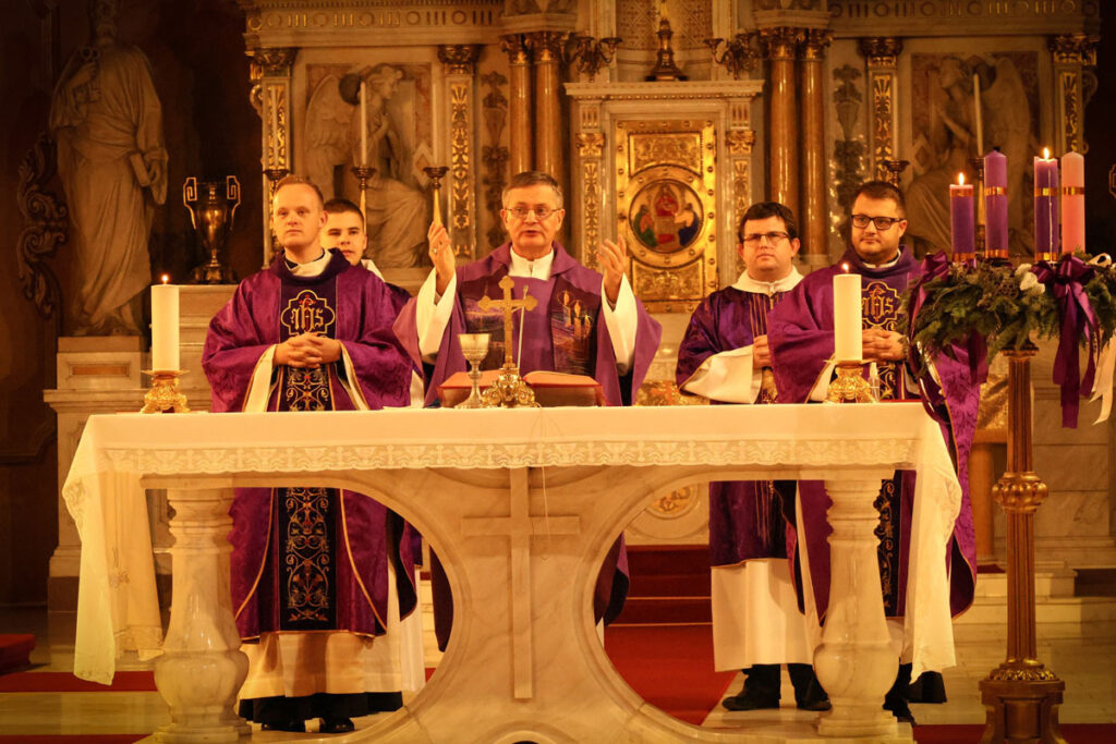 A téren a zenei szolgálatot Fehér Róbert vezetésével a Kis Szent Teréz-plébánia ifjúsági énekkara látta el. Ezt követően bevonultak a jubileumi kereszttel a székesegyházba, ahol 18 órától az ifjúsági szentmise vette kezdetét, amelynek főcelebránsa Schönberger Jenő megyés püspök volt. A szentbeszédet Mayer Nándor ifjúsági és ministránslelkész mondta, aki rámutatott: „Advent második vasárnapjának üzenete, hogy a csend teremti meg a tiszta, hiteles szó lehetőségét, ahogyan Keresztelő Szent János életében is összekapcsolódott a puszta és a prófétai hang. A belső csendben az ember megszabadul a fölöslegtől, és újra meghallhatja Isten szavát. János keménysége nem harag volt, hanem szeretetből fakadó figyelmeztetés a képmutatás veszélyére. Aki alázattal közeledik, az új életet talál, mert Isten a nyitott szívet fogadja el, nem a látszatot. Advent így a visszafordulás, a megtisztulás és az újrakezdés kegyelmi idejévé válhat.”