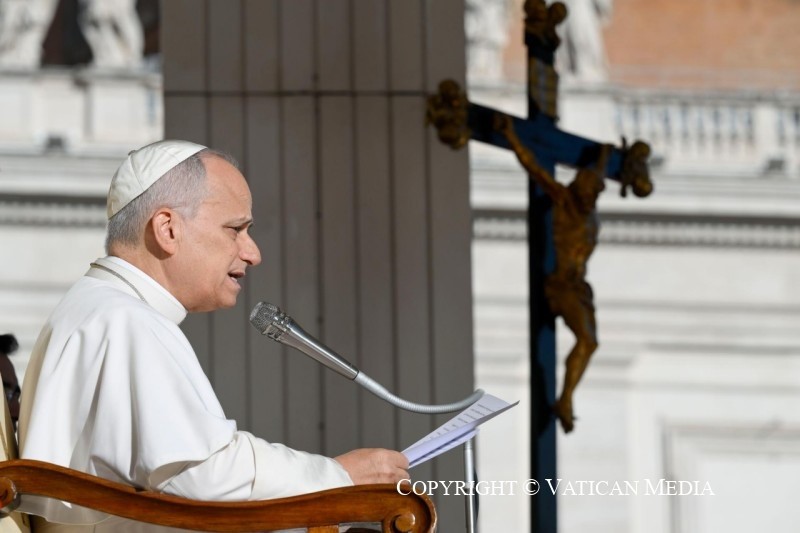 A katekézis evangéliumaként Jézus temetése történetét olvasták fel világnyelveken, ahogy „levették testét a keresztről, lepedőbe burkolták és Arimateai József frissen metszett sziklasírjába helyezték” (vö Lk 23,52–54). Leó pápa ehhez a szöveghez fűzte gondolatait. A halál misztériuma mindig is mély kérdéseket vetett fel az emberekben. A halál ugyanis egyszerre tűnik a legtermészetesebb, ugyanakkor a legtermészetellenesebb eseménynek is. A halál természetes, mert a földön minden ember meghal. Természetellenes, mert az élet és az örökkévalóság utáni vágy, amelyet önmagunk és szeretteink iránt érzünk, a halált mintegy ítéletként tekinti, mely szemben áll az értelemmel.
