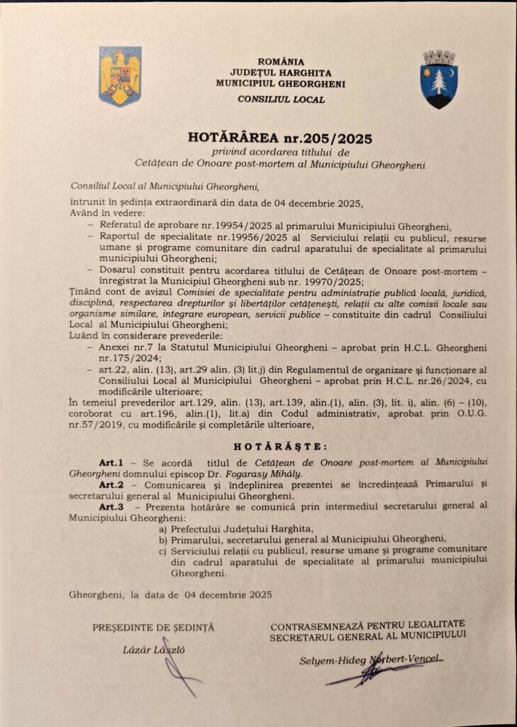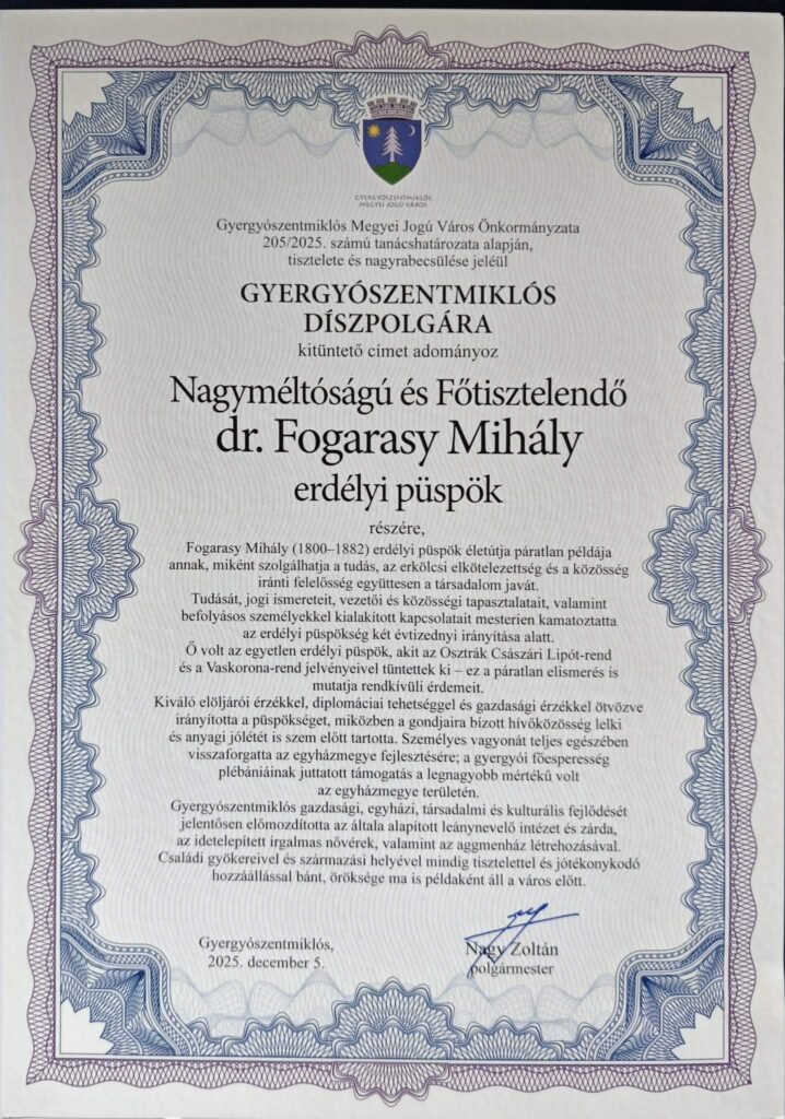 Amint arról korábban hírt adtunk, a Szent Miklós-napi dísztanácsülésen gyergyószentmiklós önkormányzata elismerésben részesítette mindazokat a személyeket, szervezeteket, intézményeket és cégeket, akik kiemelkedő tevékenységükkel és példamutatásukkal hozzájárultak a város fejlődéséhez, a közösség építéséhez. Ez alkalommal Gyergyószentmiklós díszpolgára (post mortem) lett Fogarasy Mihály erdélyi püspök életútja elismeréseként, amellyel tudásával, vezetői és közösségi tevékenységével a társadalom javát szolgálta, és előmozdította a város gazdasági, egyházi és kulturális fejlődését. A díjat Kovács Gergely gyulafehérvári érsek vette át. Az alábbiakban Bernád Rita Magdolna által mondott laudációt olvashatják.