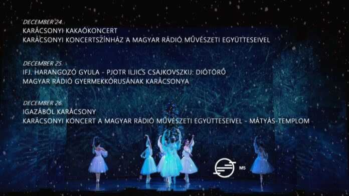 December 25-én 17:55-től a Magyar Rádió Gyermekkórusának meghitt válogatása nyitja az estét, majd 21:10-kor Csajkovszkij klasszikusa, a Diótörő kel életre a Budapesti Operettszínház látványos előadásában, ezután 22:55-től a Gyermekkórus karácsonya című koncert teremt ünnepi hangulatot. December 26-án 17:55-kor az M5 megismétli a közmédia zenés meglepetésműsorát, amely december 24-én este mutatkozik be a Dunán, majd 21:05-kor az Igazából karácsony koncert gondoskodik az ünnepi hangulatról. A késő esti órákban, 23:10-kor a Mátyás-templomban rendezett karácsonyi koncerttel végződik a nap zenés kínálata: C. P. E. Bach Magnificatja és Corelli karácsonyi concertója különleges atmoszférát teremt.