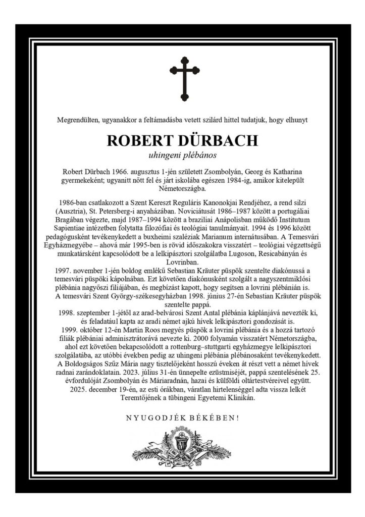 A Temesvári Római Katolikus Püspökség megrendülten, ugyanakkor a feltámadásba vetett szilárd hittel tudatja, hogy elhunyt Robert Dürbach uhingeni plébános. Lelke üdvéét 2026. január 13-án, kedden 12 órakor szentmisét tartanak a 89979 Ulm-Einsingenben található Szent Katalin-templomban.