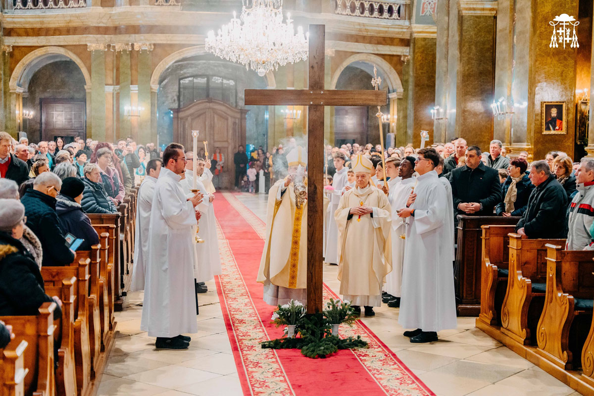 Pék Sándor, a székesegyház plébánosa kiemelte: a szentév szimbóluma a kapu, mert Jézus azt mondja, én vagyok a kapu. Ugyanúgy a kereszt is egy kapu, a megváltás kapuja. A missziós keresztet egy évvel ezelőtt helyezték el a székesegyházban, és január másodikán tartották az első missziós napot. Ezt követően minden hónap első csütörtökén missziós napokat tartottak az egyházmegye templomaiban, közösségeiben a kereszt jelenlétében. A napok keretében szentmisékre, tanúságtelekre, missziós beszédekre, szentségimádásra került sor. Minden szimbolizálta az igazságot, az életet, az örömöt az úton levést, amiben Isten részesít bennünket – fogalmazott Pék Sándor. A Szent Család vasárnapi szentmisén részt vett Roos Márton nyugalmazott temesvári megyés püspök és közreműködött a Szent László Ének- és Zenekar.