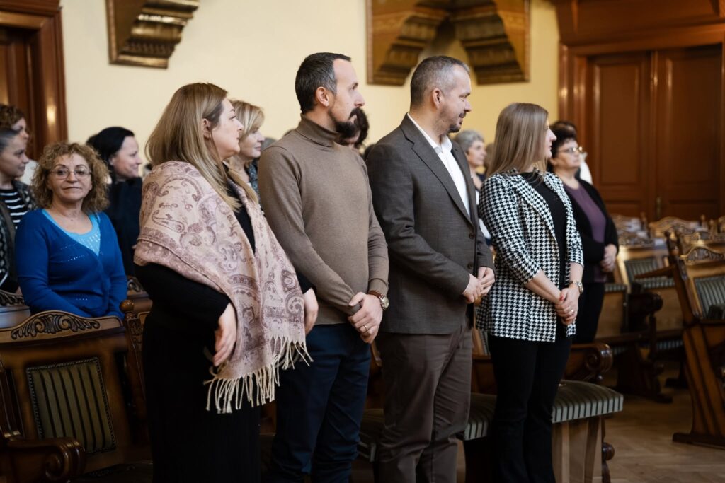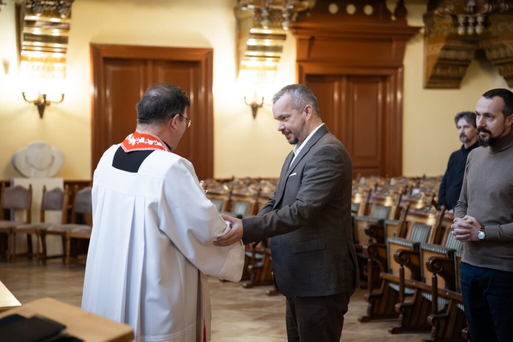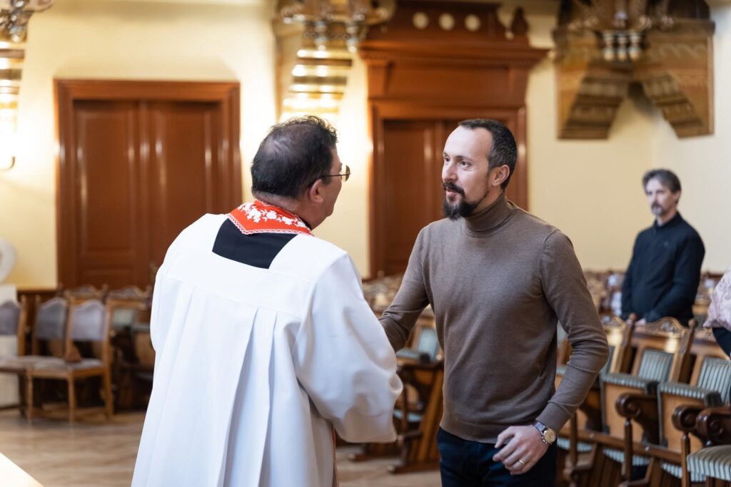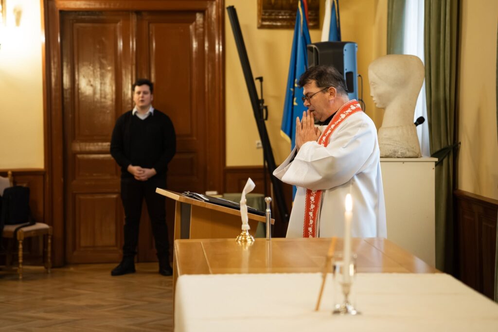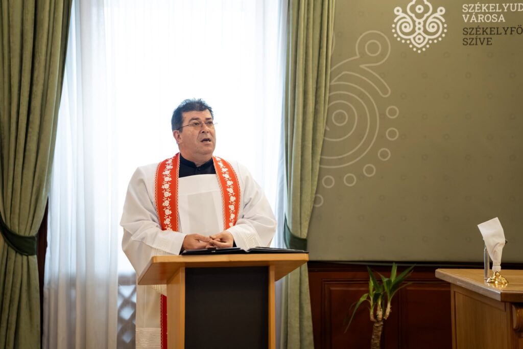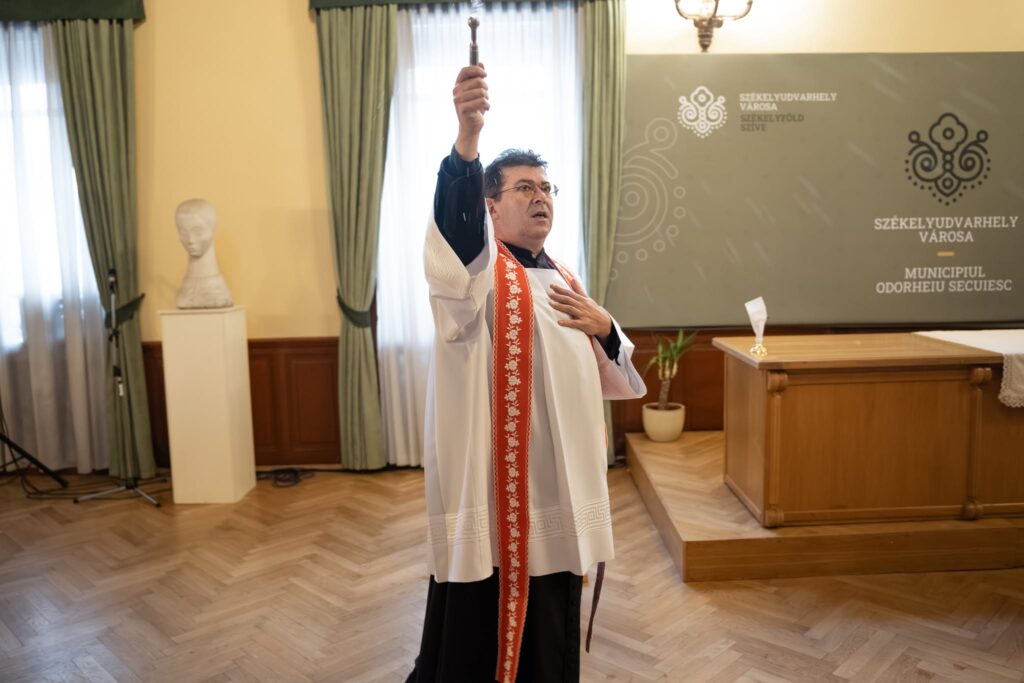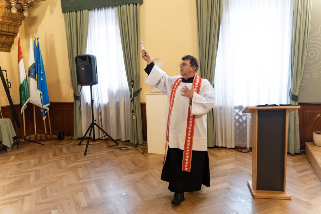 Márton József, a Szent Miklós-hegyi plébánia főesperes-plébánosa és Kovács Mózes-József kántor voltak a polgármesteri hivatal vendégei. A főesperes megszentelte a városháza épületét, Isten áldását kérve az itt dolgozókra, családjaikra és a polgármesteri hivatalba betérőkre.