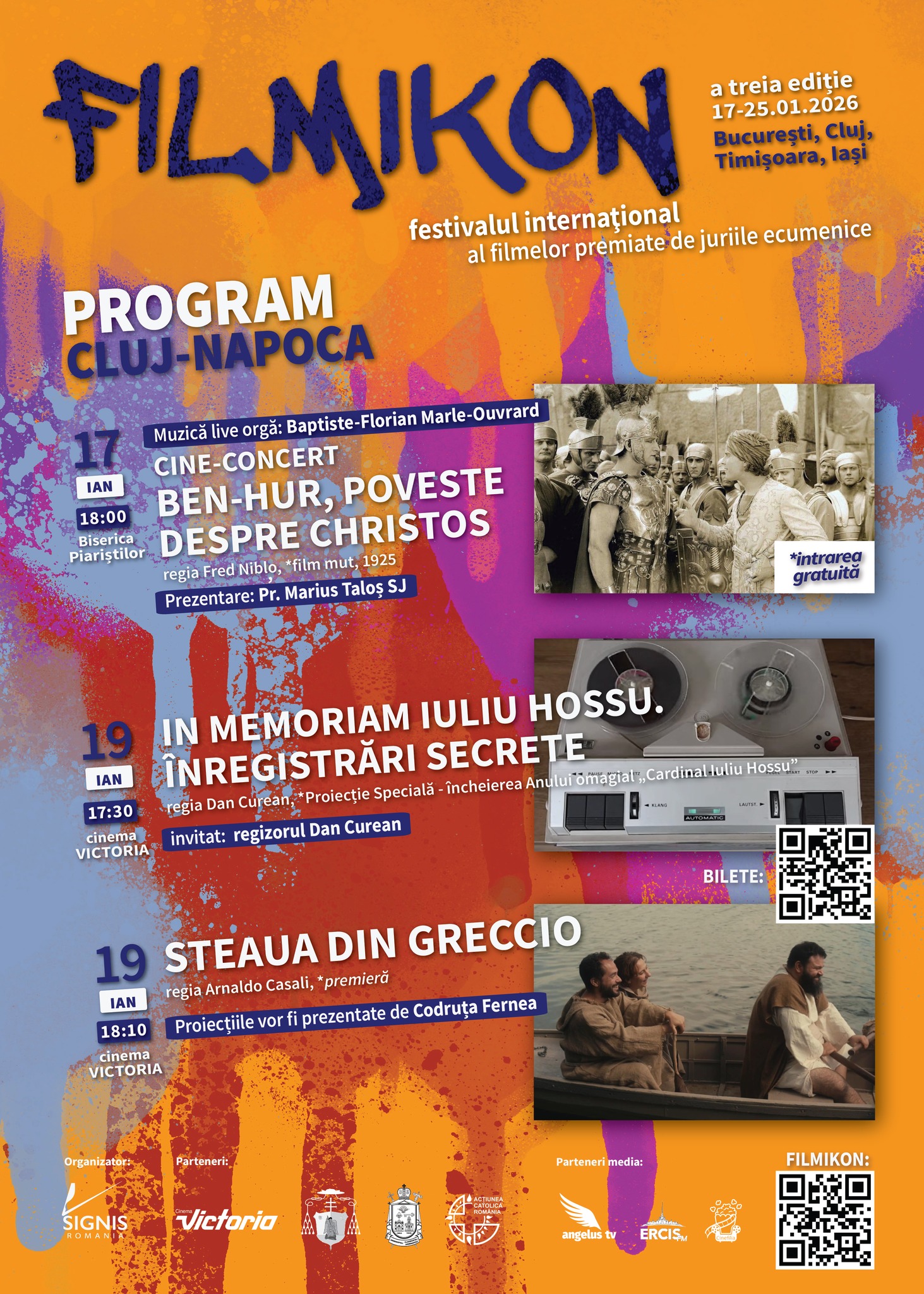 A Győzelem (Victoria) moziban hétfőn, január 19-én 17:30-tól folygtatódik a Filmikon kolozsvári programja, ahol lehetőség nyílik megtekinteni Dan Curean Boldog Iuliu Hossuról szóló dokumentumfilmjét, amely a bíborosnak dedikált emlékév lezárására készült. Az alkotás címe In memoriam Iuliu Hossu. Înregistrări secrete din domiciliul forțat de la Mănăstirea Căldărușani. Ezután vetítik le az Arnaldo Casali rendezte La Stella di Greccio című történelmi filmet, amely az Assisi Szent Ferencig visszavezethető betlehemállítás hagyományába enged betekintést.