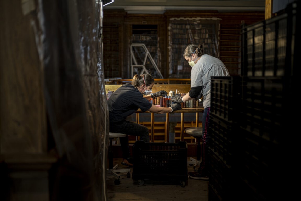 Ezt kihasználva egy másik jelentős szakmai munkát is elvégeztek. Az 1830-as években az akkori asztalosok túl szélesre szabták a polcokat, amelyek a kötetek súlyától meghajlottak. A gyűjtemény védelme érdekében ezért 400 darab, egyedi látámasztást építtettek be.
