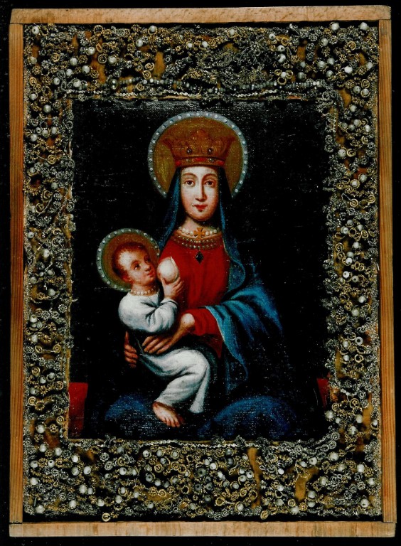 Ábrázolásunk keletkezési idejéről és eredetéről kevés biztosat tudunk. Eredetileg a merzydorfi plébániatemplomban volt elhelyezve, fémkeretbe foglalva, koronával és sugárkoszorúval díszítve. A néphagyomány kegyképként tartotta számon, amelyet a zarándokok magukkal vittek a Máriaradnára vezető zarándoklatuk során. A kép egy fából készült dobozba van süllyesztve, széles, finom filigrán- és gyöngyfonattal körülvéve. A trónon ülő Istenszülőt ábrázolja, amint ölében tartja a gyermek Jézust, és anyai mellét kínálja neki. A merczyfalvi helytörténeti könyv szerint a képet állítólag a mezőn találták.