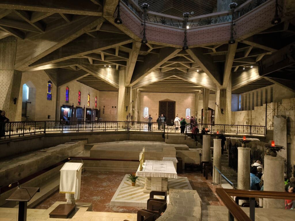 Jézus első csodatettének helyszíne, Kána kétségkívül fontos bibliai helyszín, gondoljunk csak a híres menyegzőre, ahol a vizet borrá változtatta. De valahogy nem annyira számottevő, hogy hosszasan időzzünk itt, úgyhogy haladjunk tovább! Názáret az angyali üdvözlet városa, a legnagyobb arab város: 60 százalékban muzulmánok, 40 százalékban keresztények lakják, több mint 70 ezren. Legfontosabb látványossága az Angyali üdvözlet bazilika, amely 1967-ben épült Szűz Mária feltételezett házára. Moldován István (mozaikos) magyar Mária-ábrázolásánál ezúttal is elidőztünk, és közben Mária szerepén elmélkedtünk, ki-ki akár csendben, magában is, és egy következtetésféle: mindenki úgy tud vele azonosulni, ahogyan önmagát ismeri.