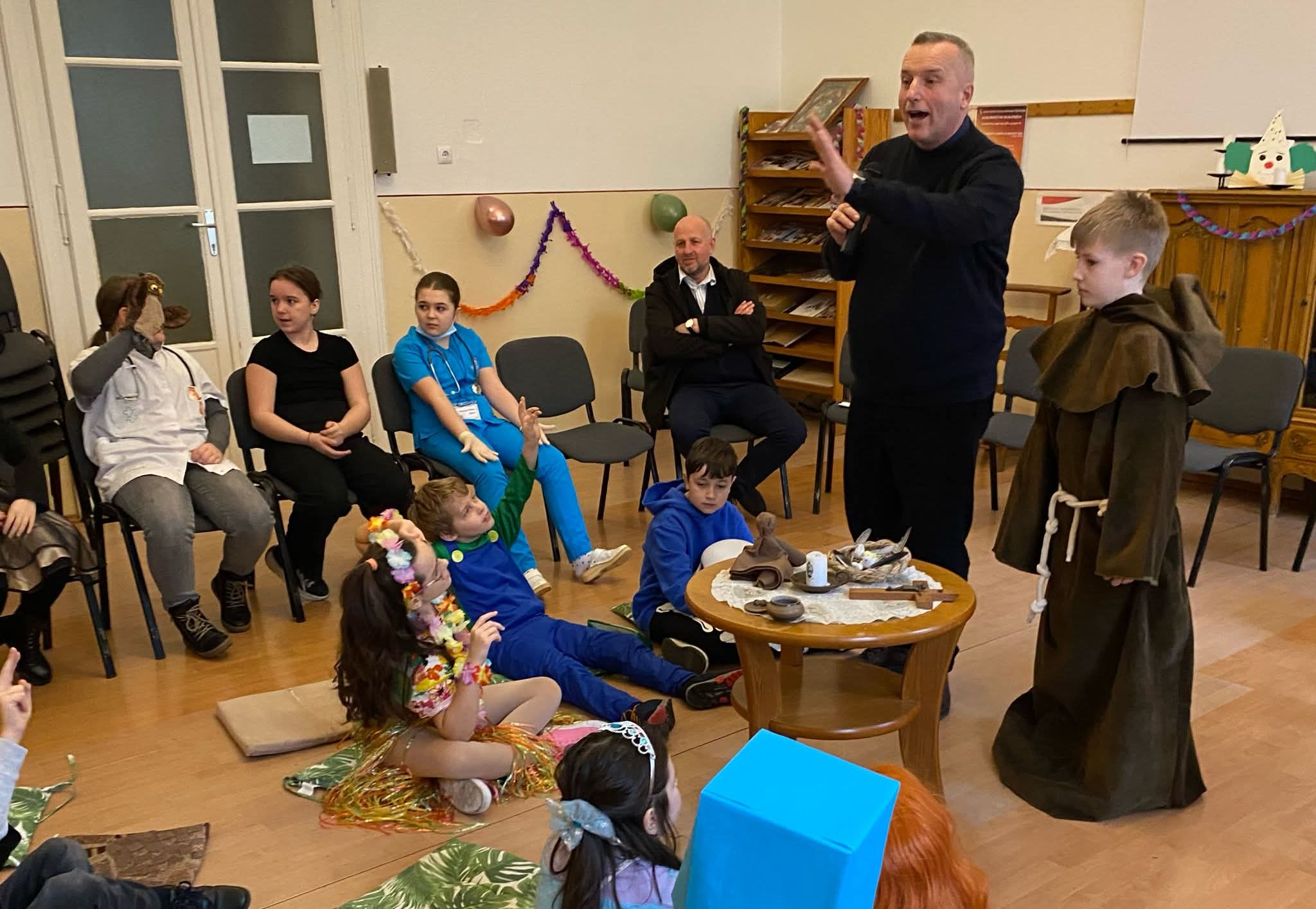 A résztvevőket Pék Sándor plébános köszöntötte, majd a farsang jelentőségéről, valamint a bibliai történetekben megjelenő öröm szerepéről beszélt a gyermekeknek. Ezt követően Szabó Ervin plébános interaktív formában mutatta be Assisi Szent Ferenc életét, a gyermekek aktív közreműködésével. A közös bemutatóba még Böcskei László megyés püspök urat is bevonták, aki jelenlétével megtisztelte a rendezvényt.